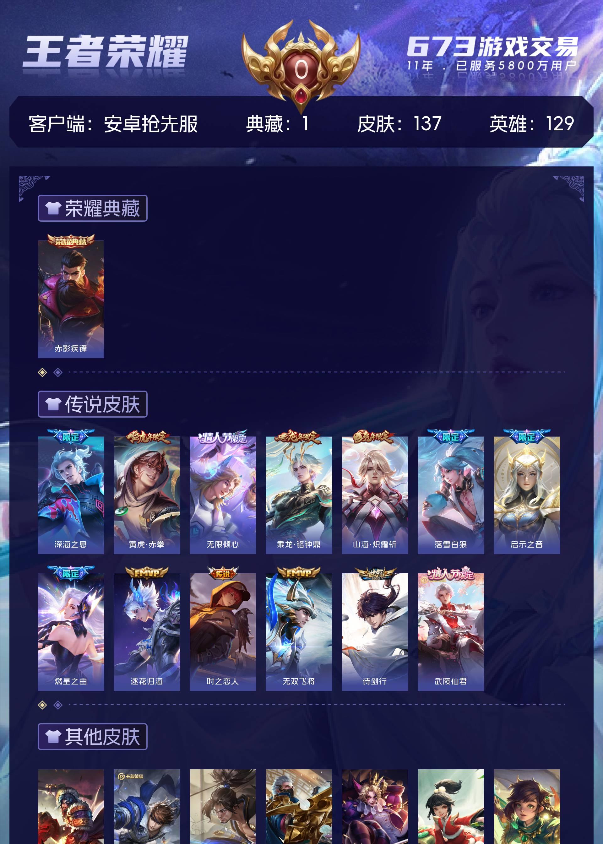 皮肤137 英雄129 永恒钻石 荣耀典藏1 传说14 其他皮肤126
