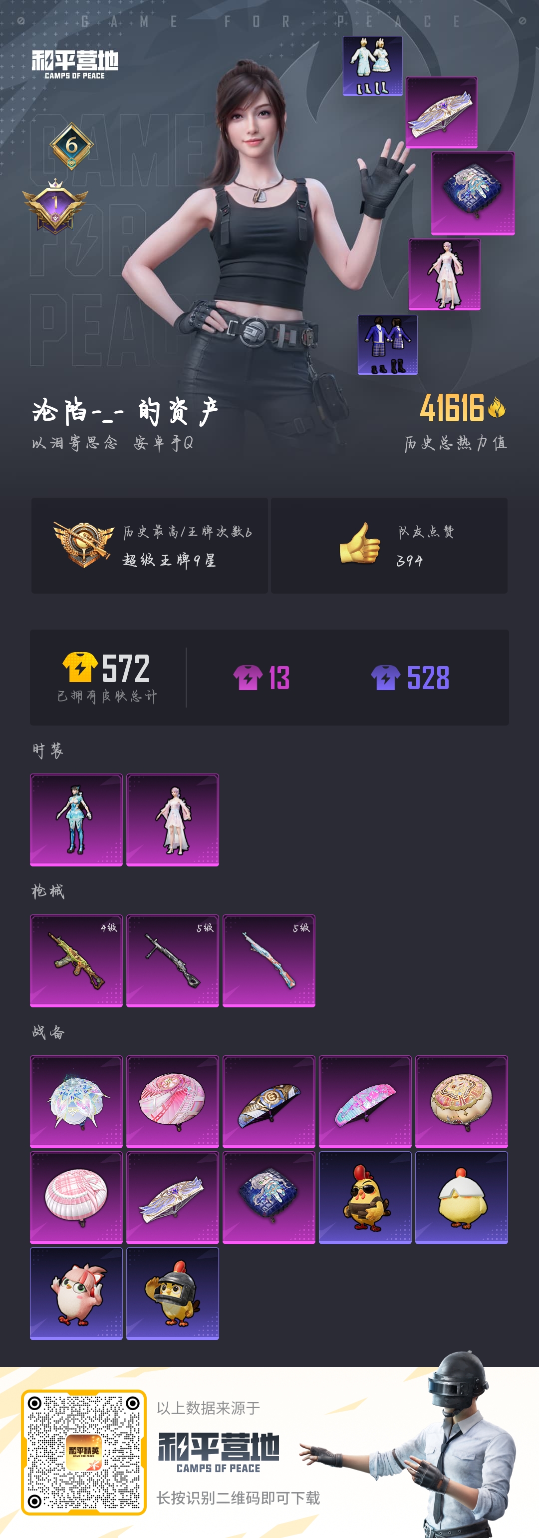 热力值:42036,2粉装,3粉枪,8粉色战备,130套装,139枪械,177装备,4滑翔尾翼