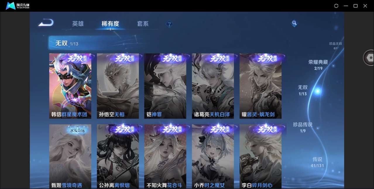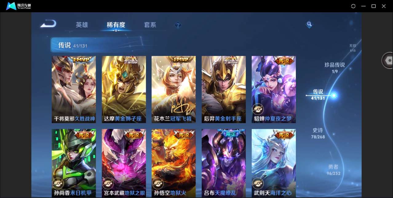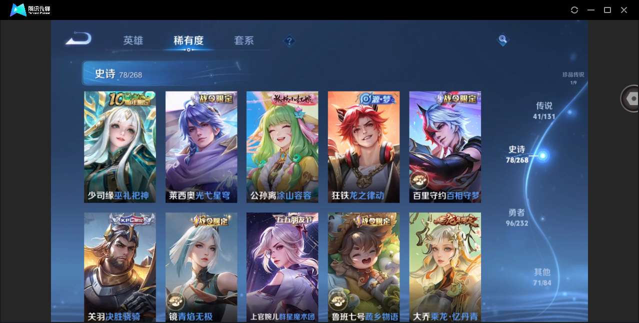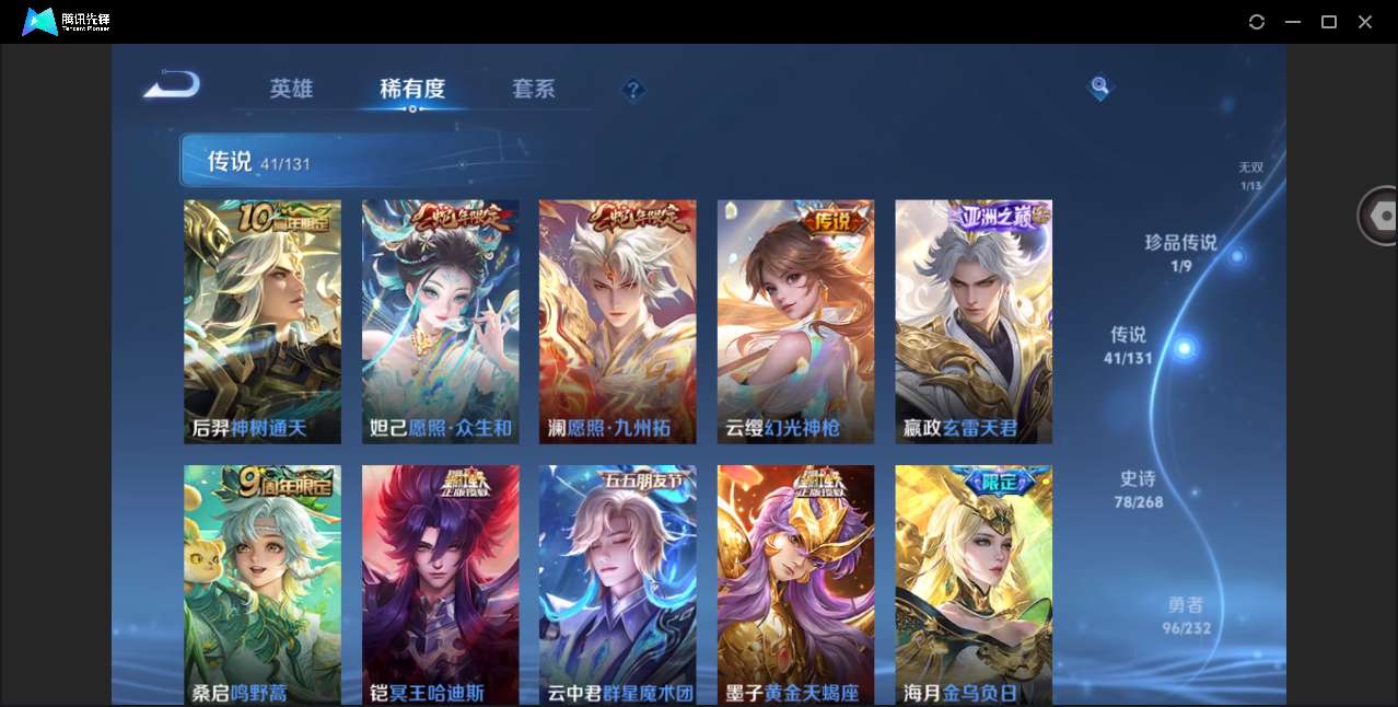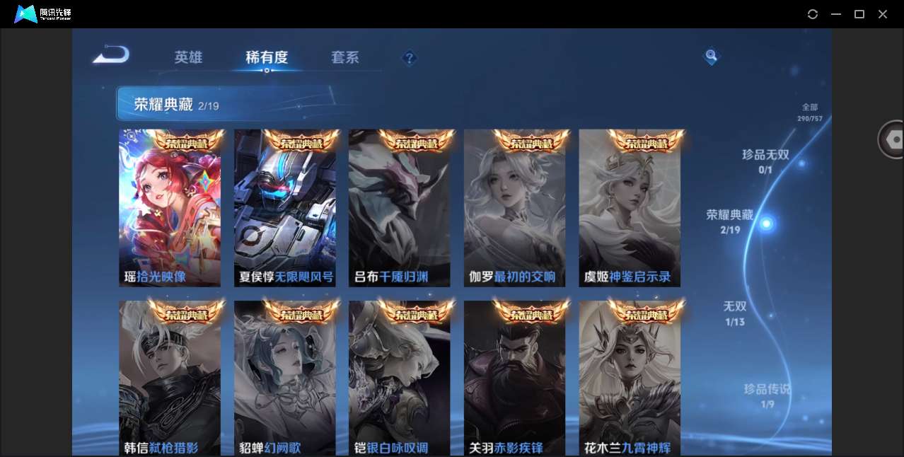 ky 苹果(q)区 290皮 3典藏 1无双 1珍品传说 41传说 94限定 4王者印记 1星