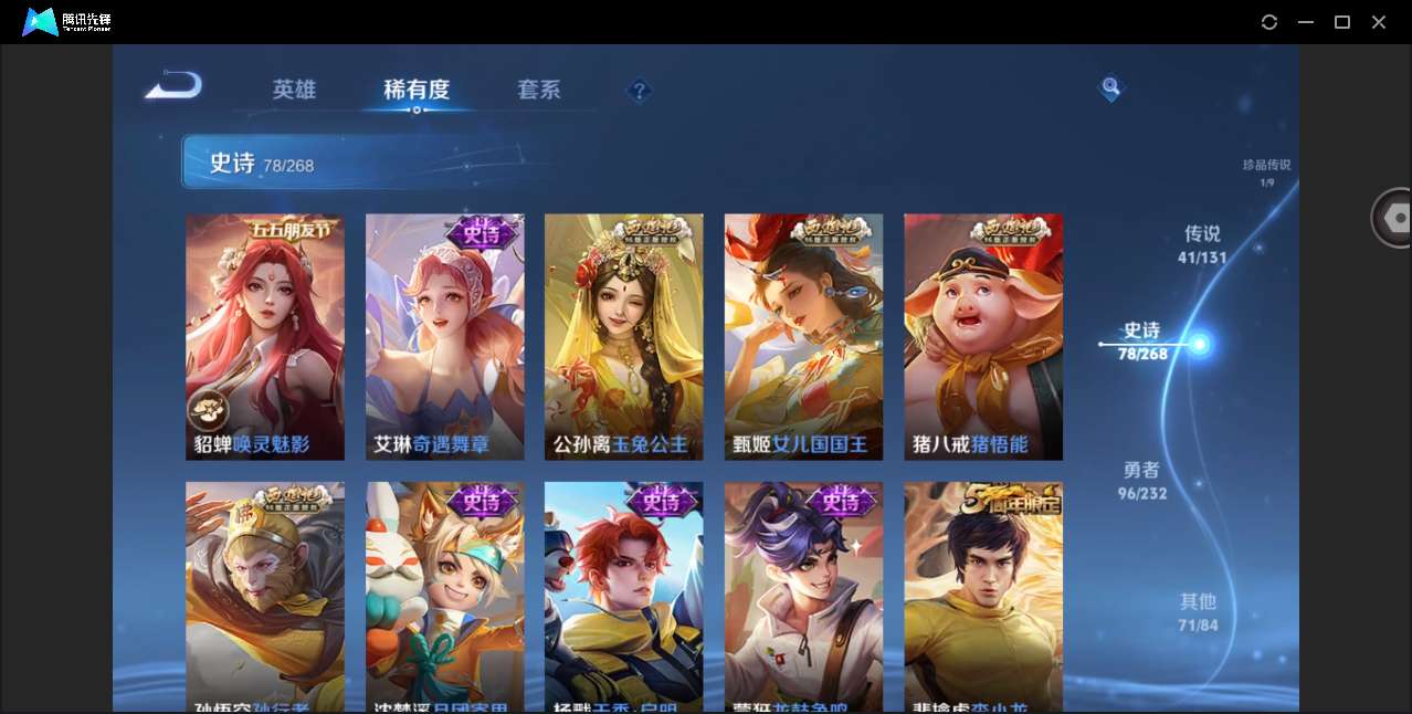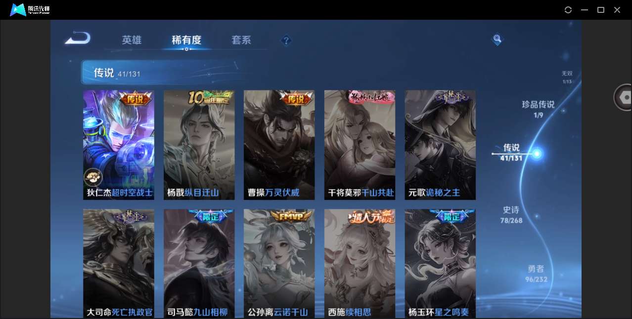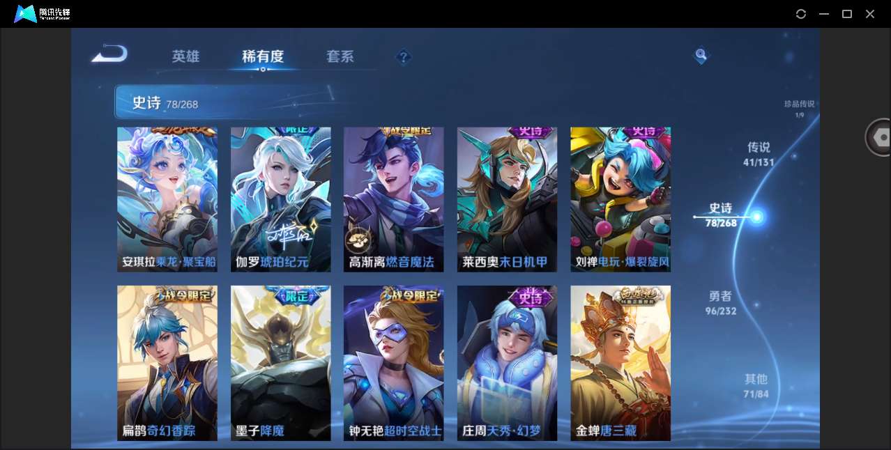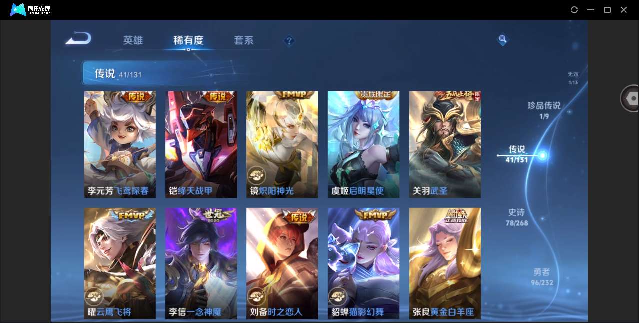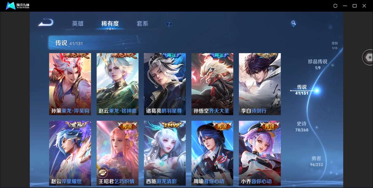 ky 苹果(q)区 290皮 3典藏 1无双 1珍品传说 41传说 94限定 4王者印记 1星
