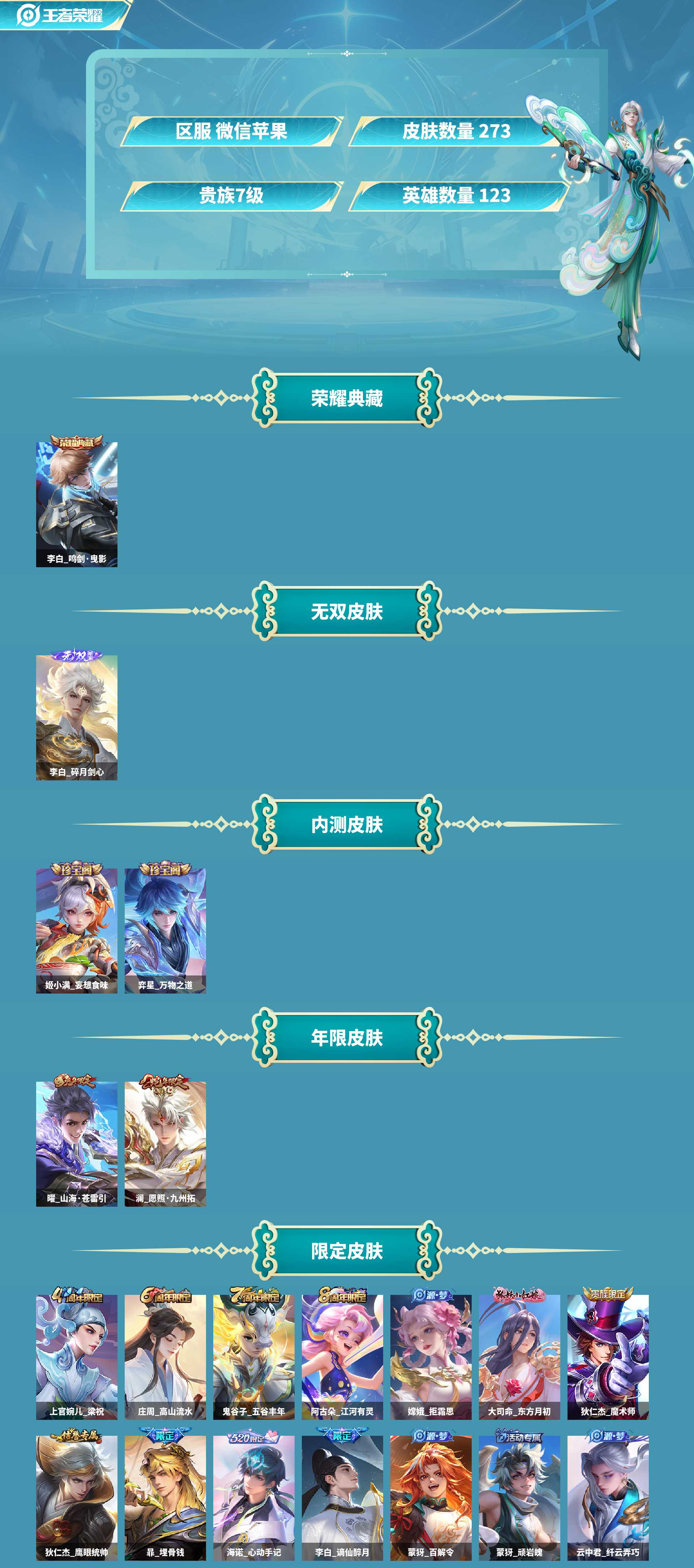 特价苹果v区273皮1水李白鸣剑曳影2无双李白碎月剑心诸葛亮天机白泽传说皮肤:虞姬启明星使,大司命死亡执政官,张良黄金白羊座,裴擒虎祥瑞亨通,澜愿照九州拓,桑启鸣野蒿,刘备时之恋人,马超琥珀纪元,澜逐花归海,马超无双飞将,诸葛亮鹤羽星尊,曜山海苍雷引,李白诗剑行,李信一念神魔,铠曙光守护者,曜云鹰飞将