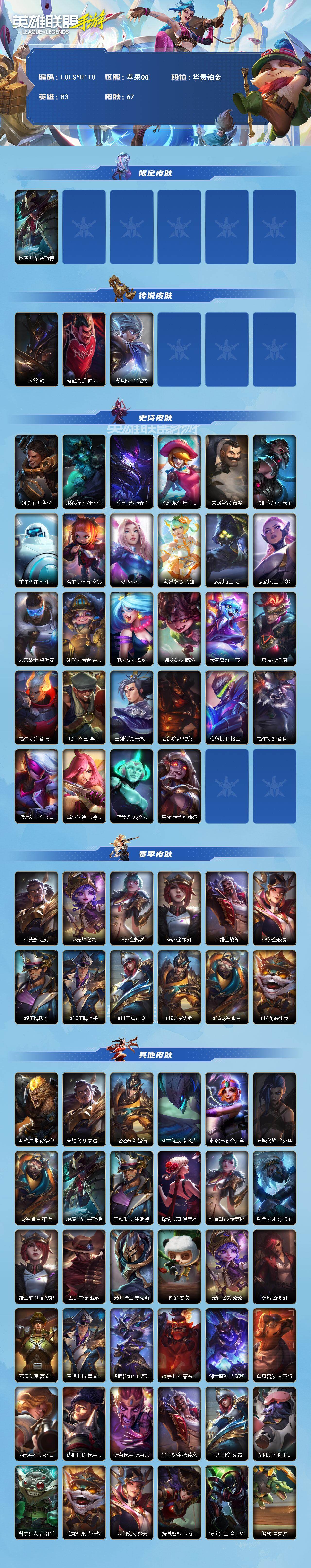 【LOLSYH110】83英雄/67皮肤/华贵铂金/地底世界 崔斯特/天煞 劫/灌篮高手 德莱厄斯/黎明使者 锐雯/钢铁军团 盖伦/地狱行者 孙悟空/暗星 奥莉安娜/泳池派对 奥莉安娜/末路管家 布隆/铁血女忍 阿卡丽/苹果机器人 布里茨/福牛守护者 安妮/K/DA ALL OUT 阿狸/幻梦甜心 阿狸/灵能特工 劫/灵能特工 凯尔/未来战士 卢锡安/娜就去看看 崔丝塔娜/电玩女神 娑娜/驯龙女巫 璐璐/太空律动 “节奏幻师” 璐璐/燎原烈焰 蔚/福牛守护者 嘉文四世/地下拳王 李青/玉剑传说