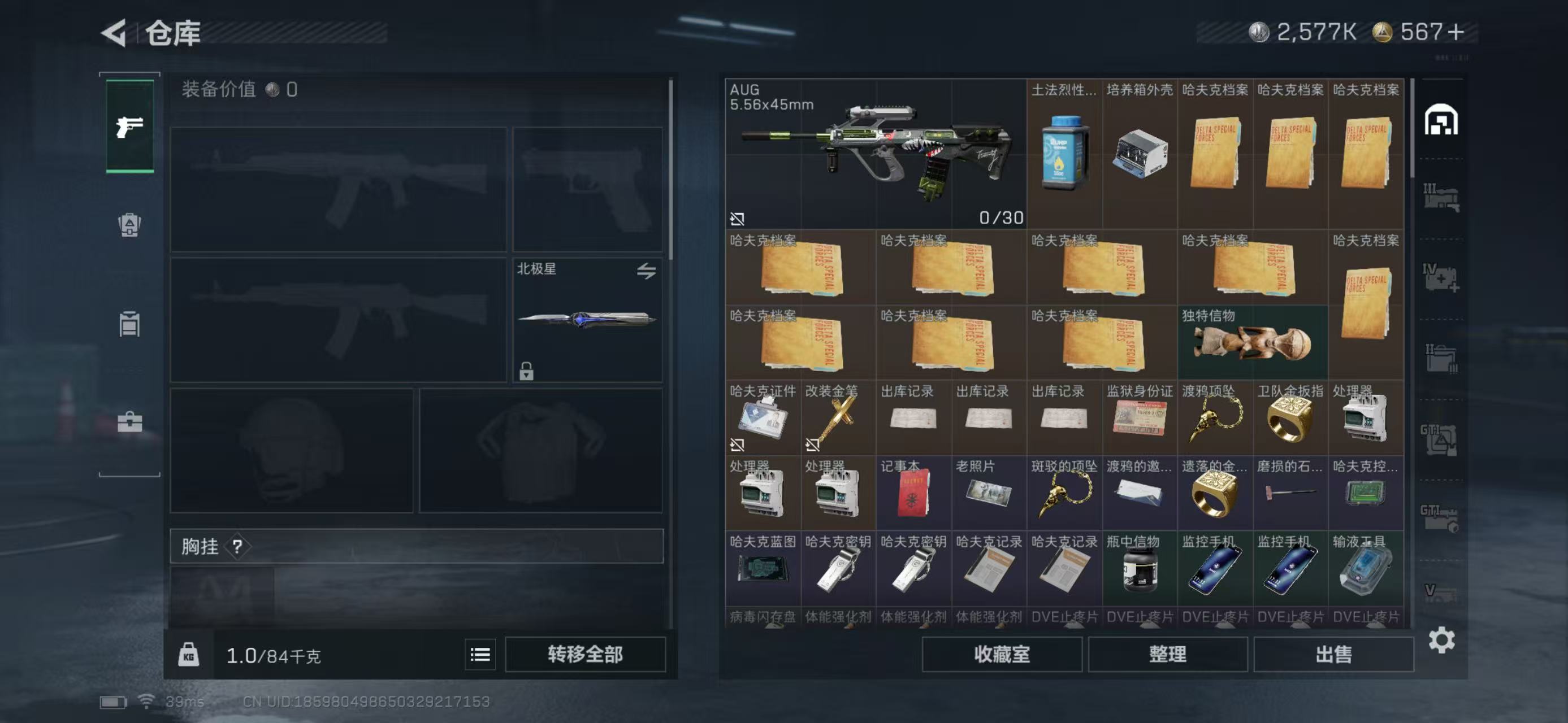总资产222.27M,哈夫币 2577.35K,战场等级:50 军士长,行动等级:60 黑鹰,角色皮