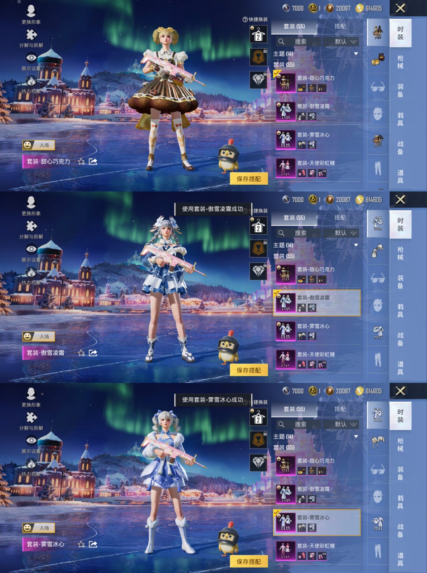 【巧克力三姐妹】2王牌印记-5粉装-1特效枪-64枪皮-55套装- 【5粉装】 宝贝奶油派 天使彩虹糖 甜心巧克力 傲雪凌霜 霁雪冰心 【1特效枪】 DP-28-豹影疾电 【1飞行器】 炫彩糖果飞行器 【7头盔】 垂柳戏鸭头盔(3级) 暖熊萌萌头盔(3级) 甜心亚梦头盔(3级) 绒雪飘舞头盔(3级) 玉兔迎春头盔(3级) 环太平洋头盔(3级) 闲梦青缨头盔(3级) 【25背包】 暖熊萌萌背包(2