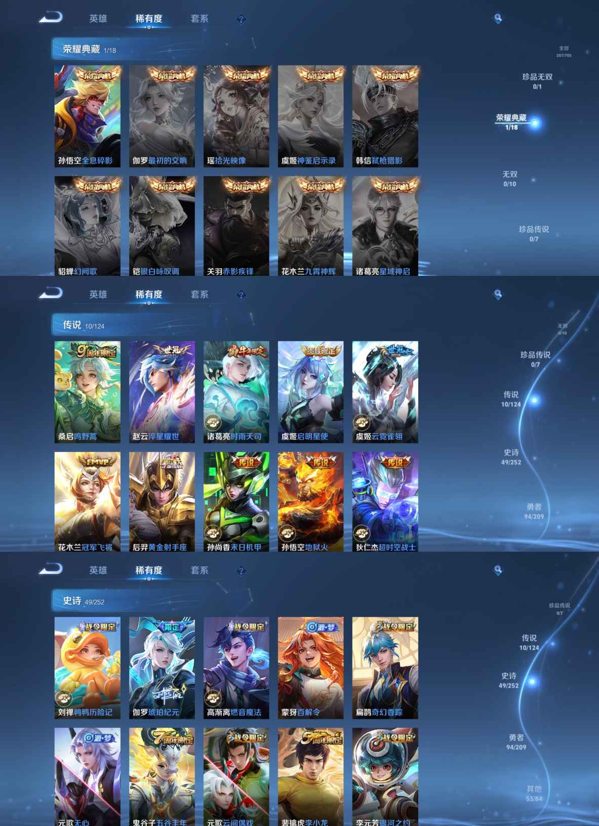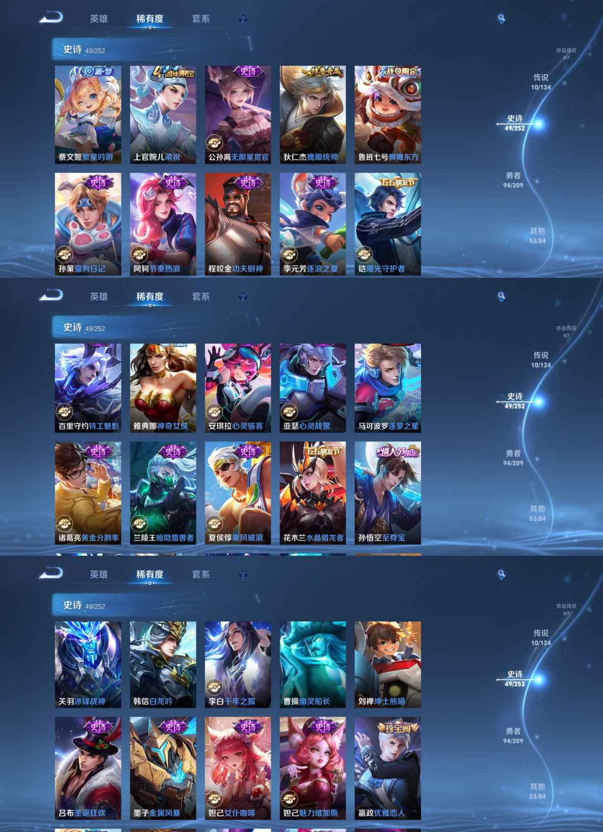 【史诗皮肤】 冰锋战神 逐梦之星 至尊宝 鸭鸭历险记 琥珀纪元 聚星闪耀 完美运算 百解令 漠中幻影 奇幻香踪 幽灵船长 繁星吟游 功夫厨神 女仆咖啡 魅力维加斯 魔术师 鹰眼统帅 圣诞恋歌 无限星赏官 白龙吟 水晶猎龙者 曙光守护者 暗隐猎兽者 千年之狐 逐浪之夏 银