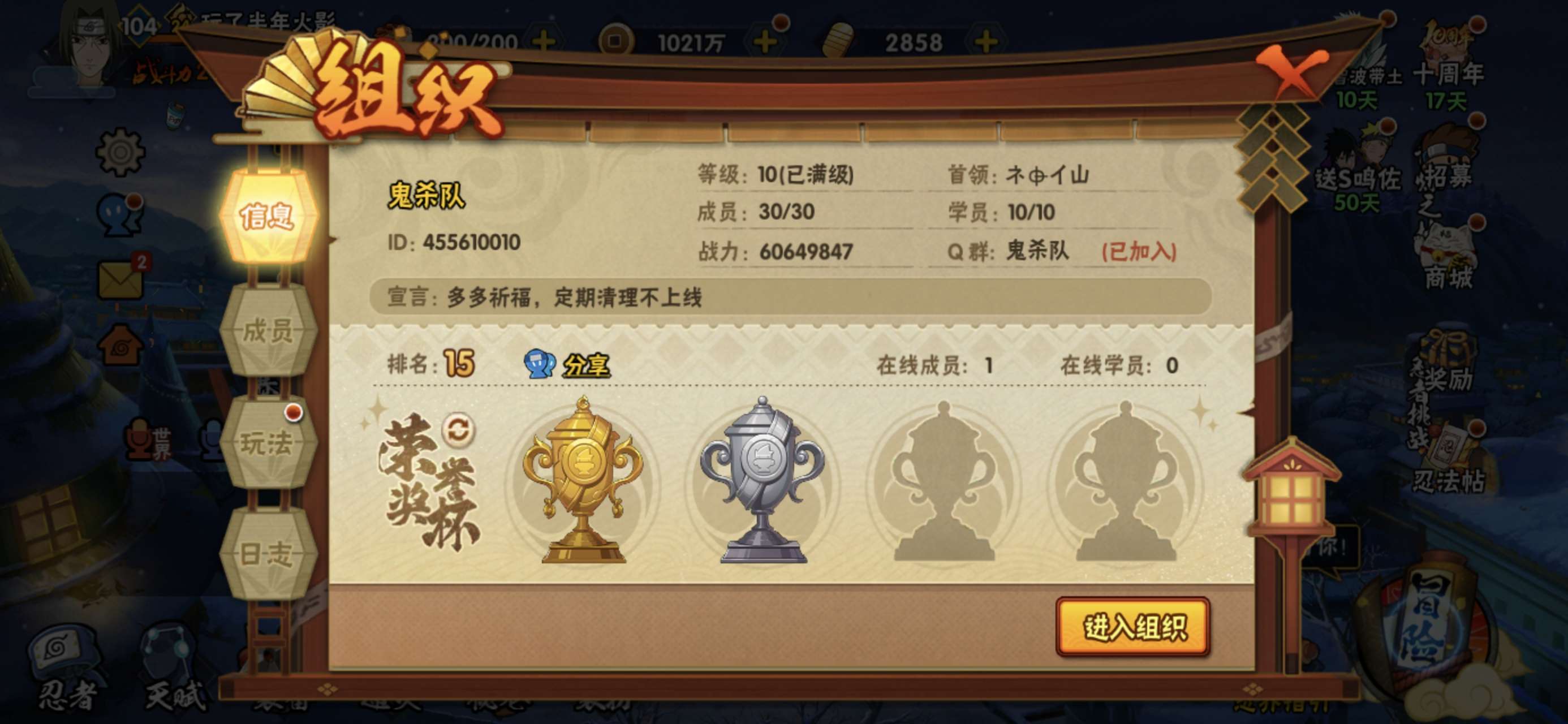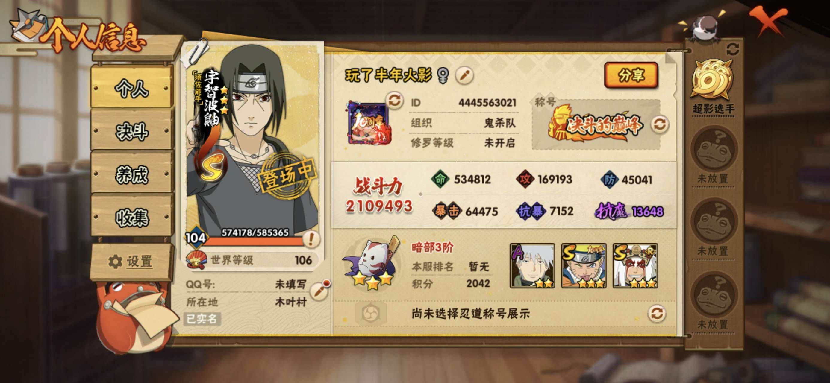 角色等级105 金币4500 战斗力2119464 S忍5 A忍16 2 段位超影