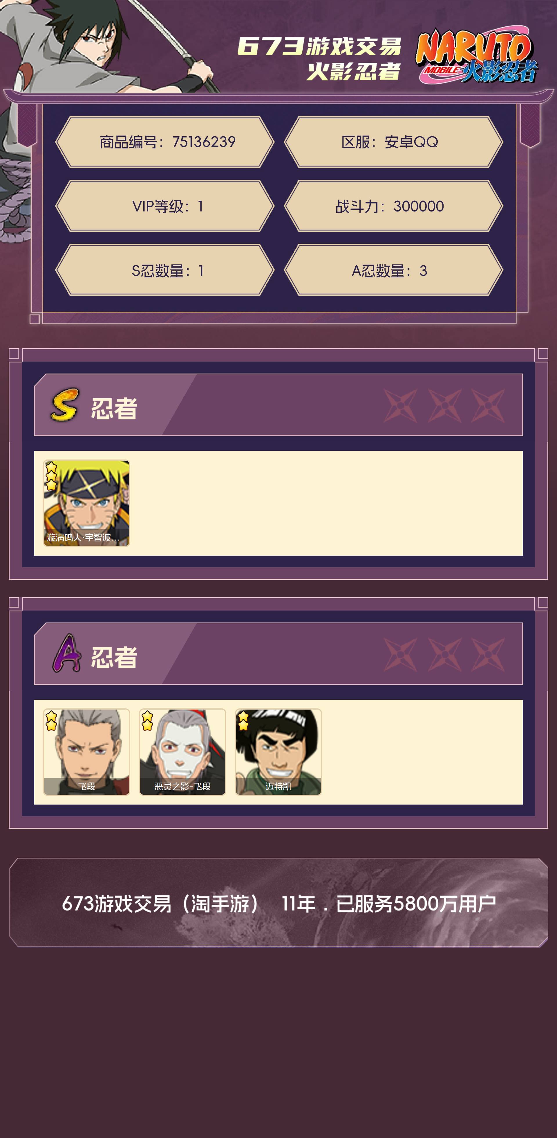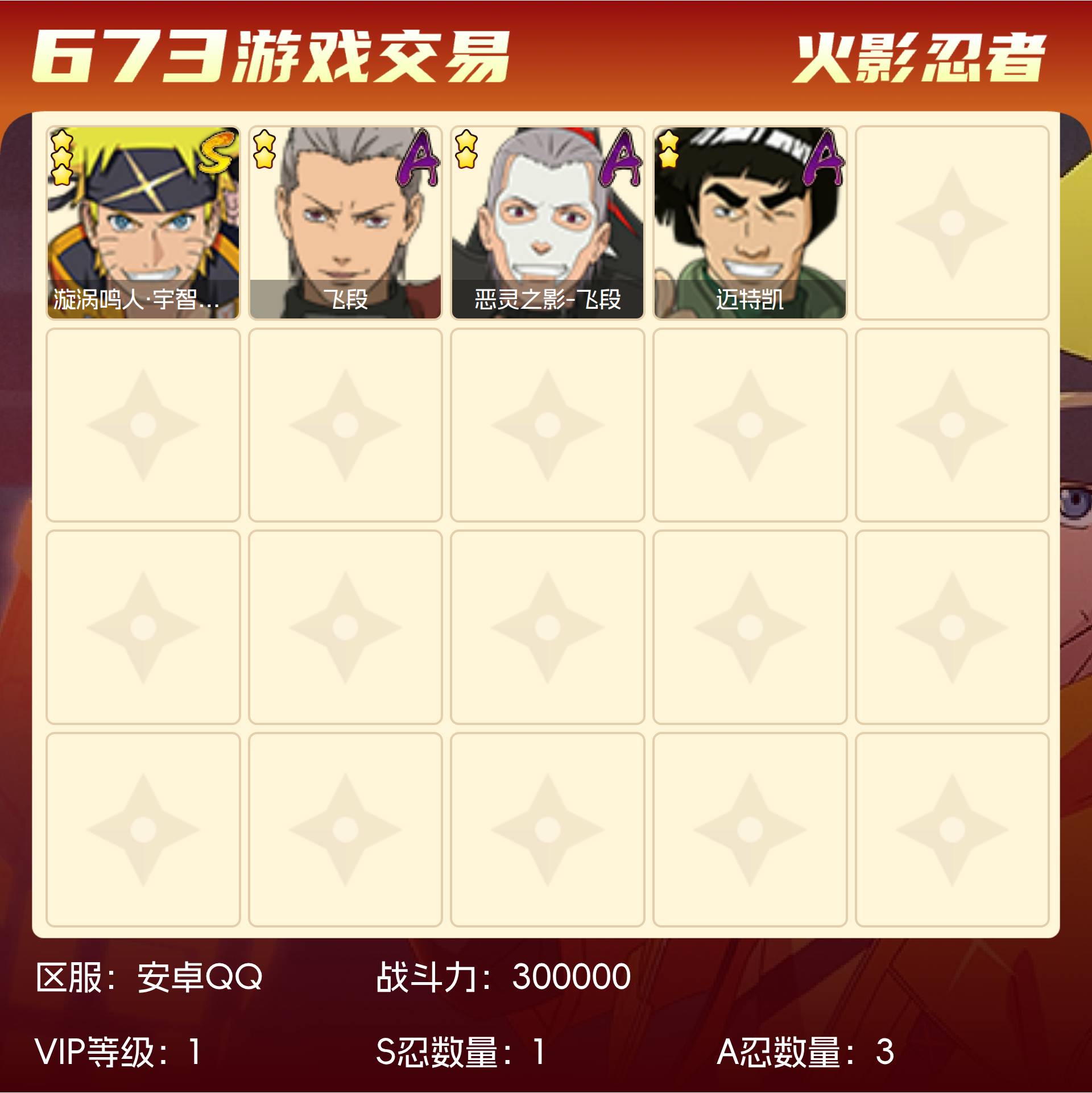角色等级56 金币999 战斗力300000 S忍1 A忍3 1 段位暗部