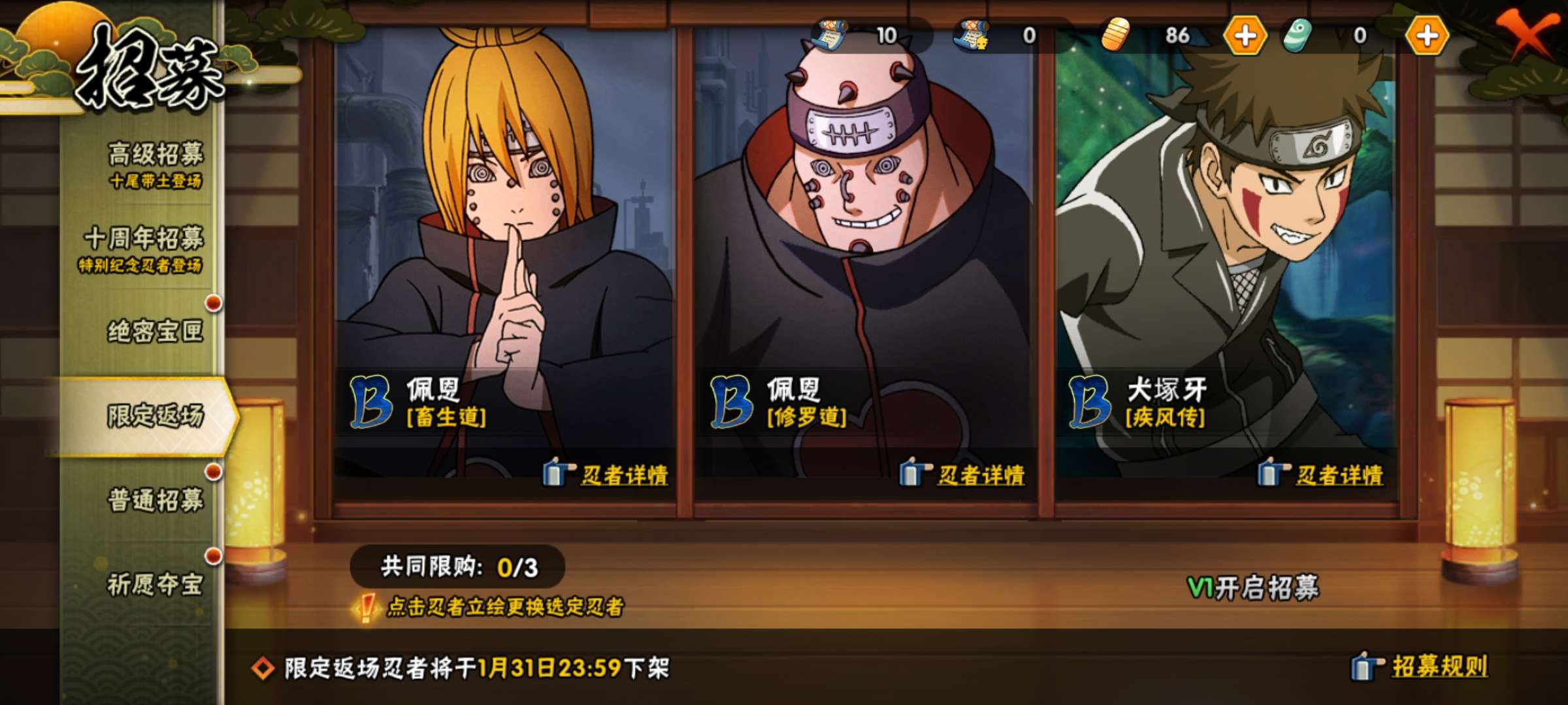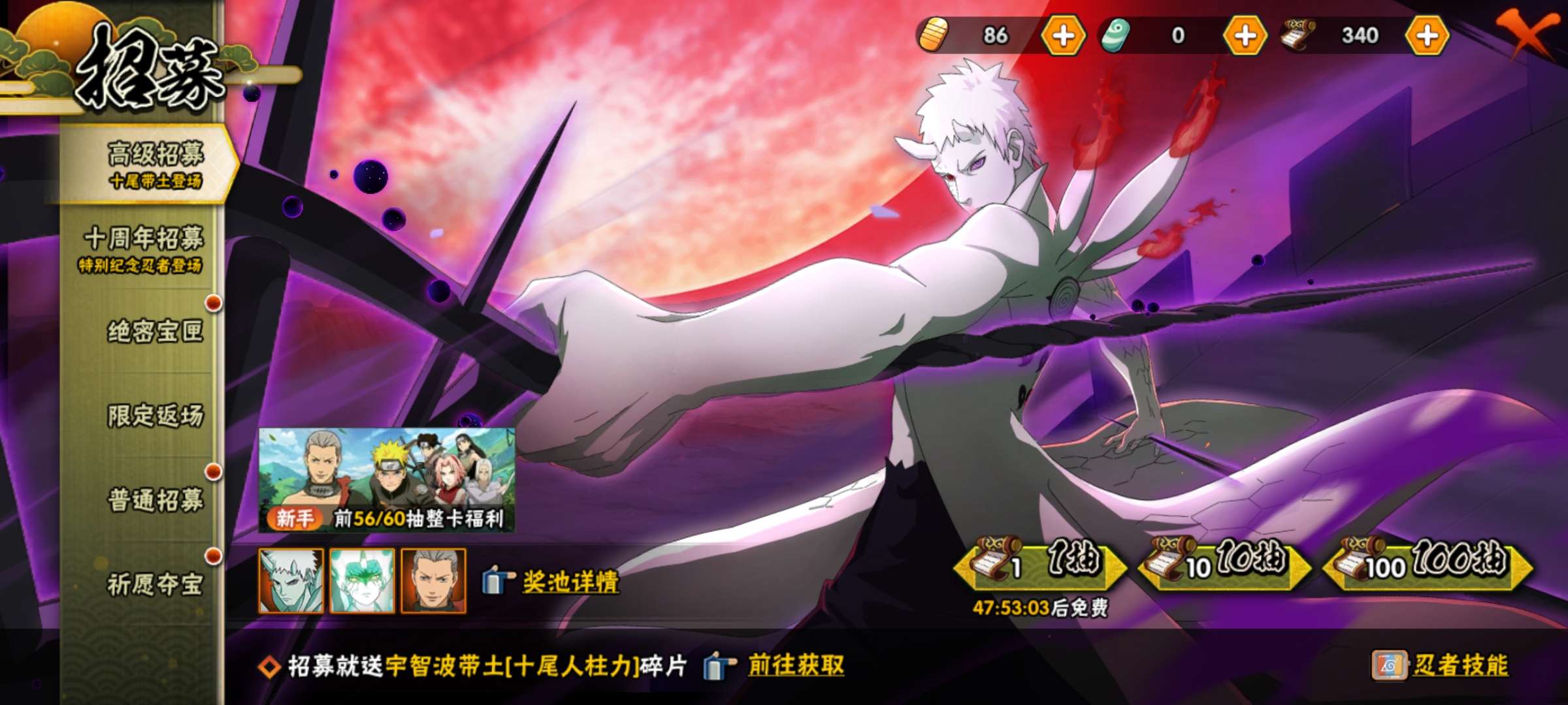 5S永恒佐助,340高招卷轴,10蓝卷可自抽六道带土。