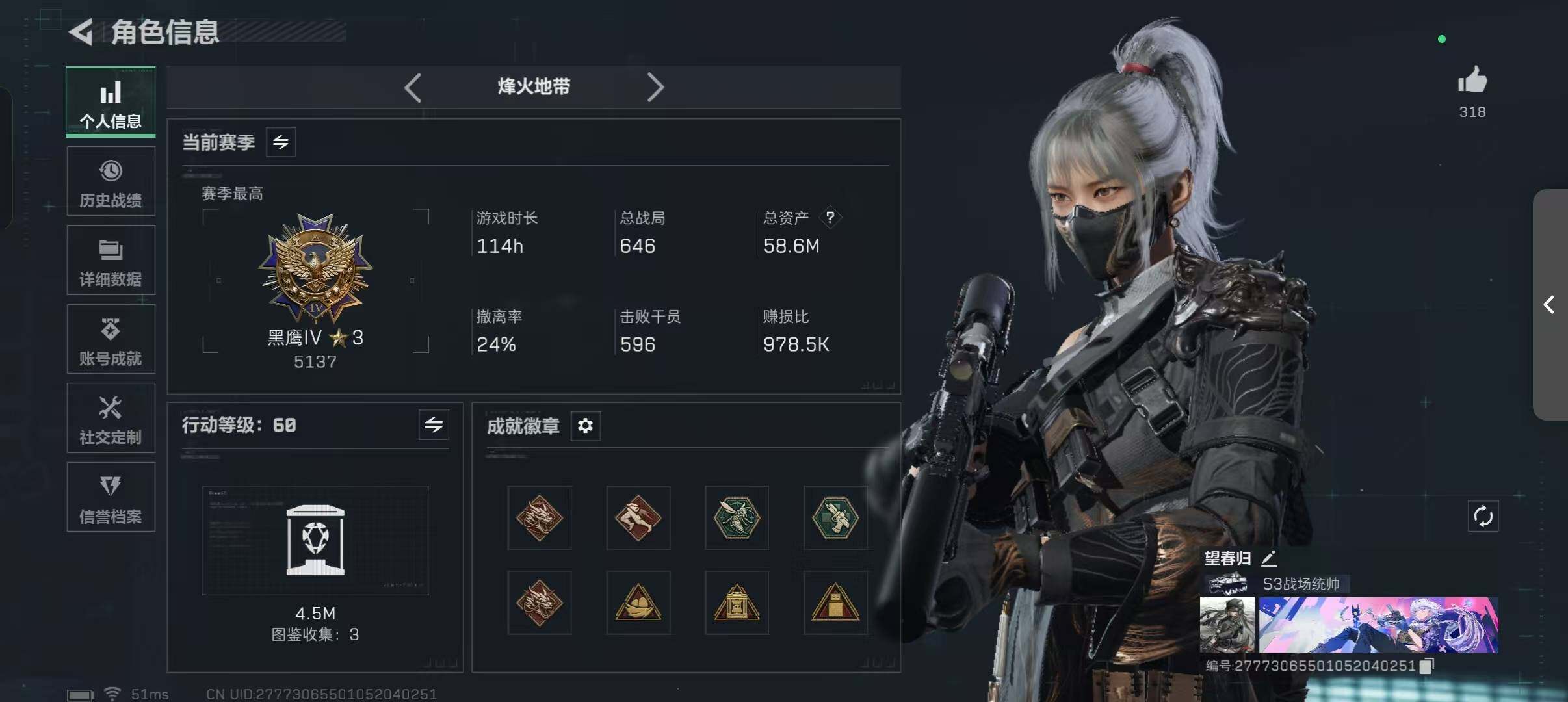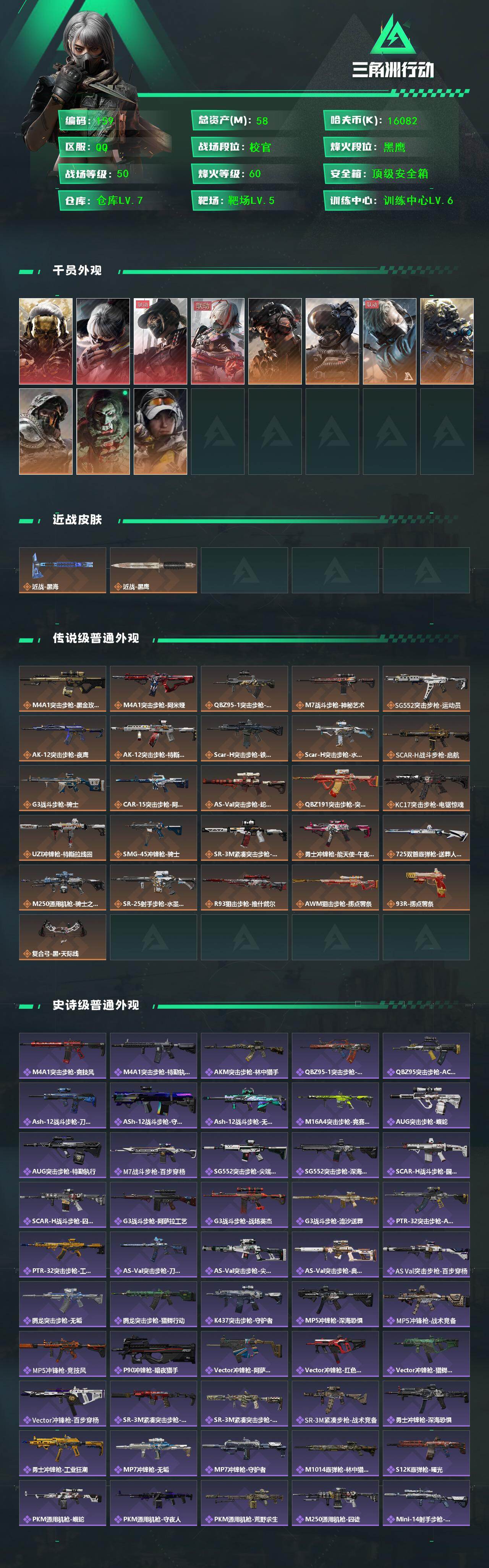 58m总资产-16082k哈伏币-60烽火等级-黑鹰-50战场等级-校官LL5708