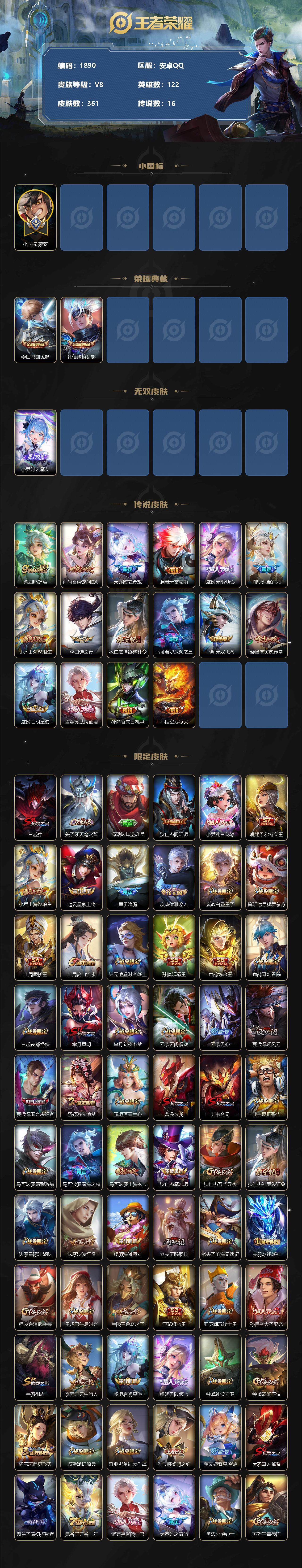 /有二次实名 喜欢可联系客服要账号详情图 精品发育射手号 小国蒙犽 超多省标 万战马克香香等【商品标题】:安卓Q-V8-永恒钻石II段位-122英雄-361皮肤-2典藏-0珍品无双-1无双-0珍品传说-16传说-112史诗