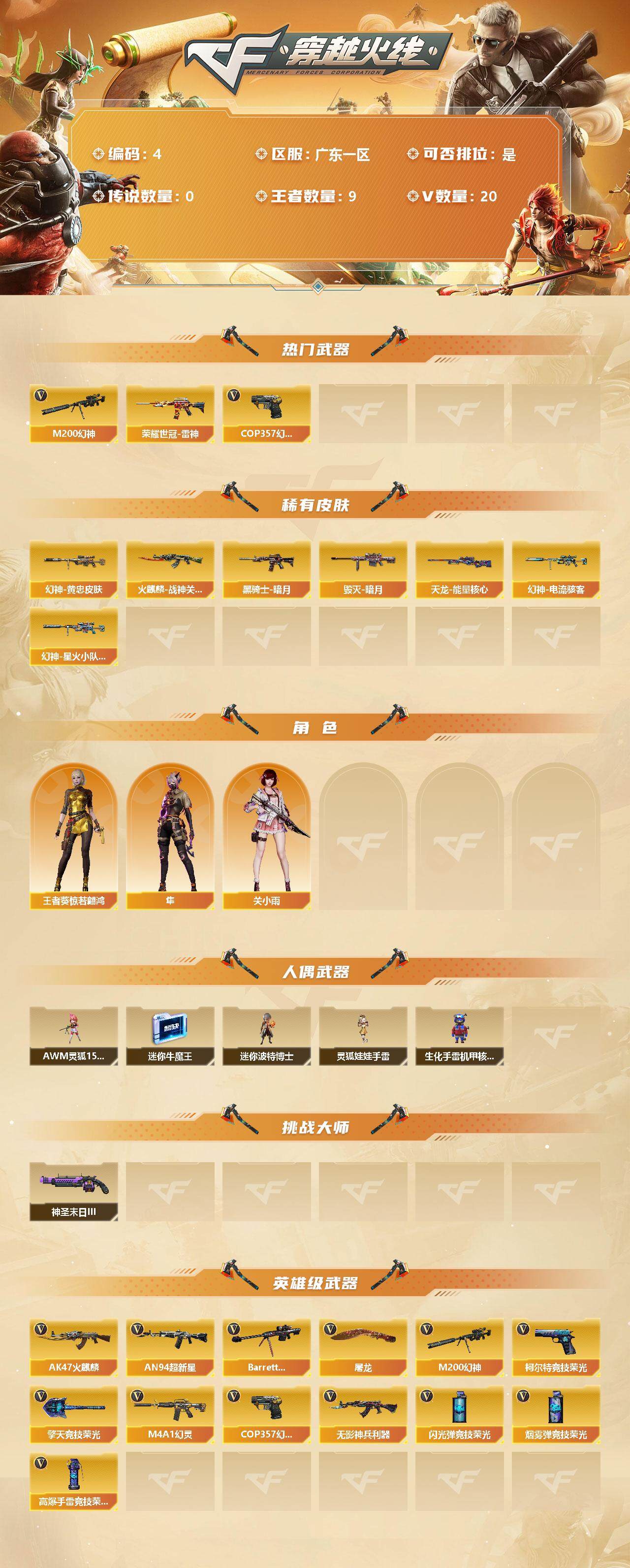 【商品标题】:广东一区-20V-9王者-0炫金【热门武器】:M200-幻神,