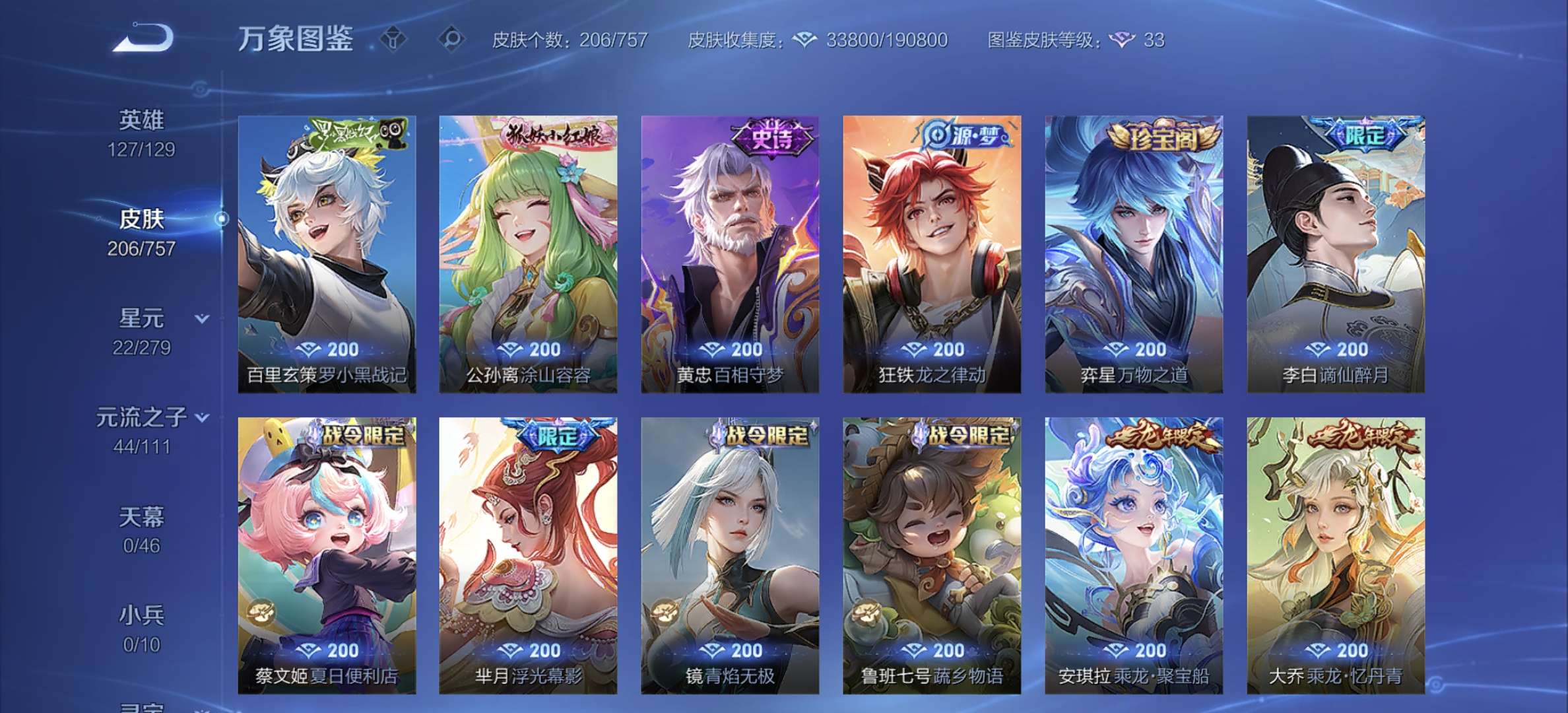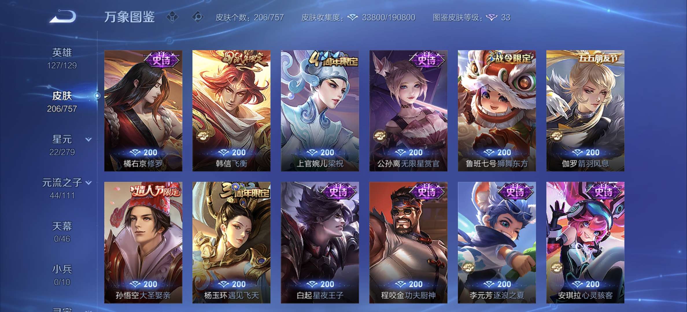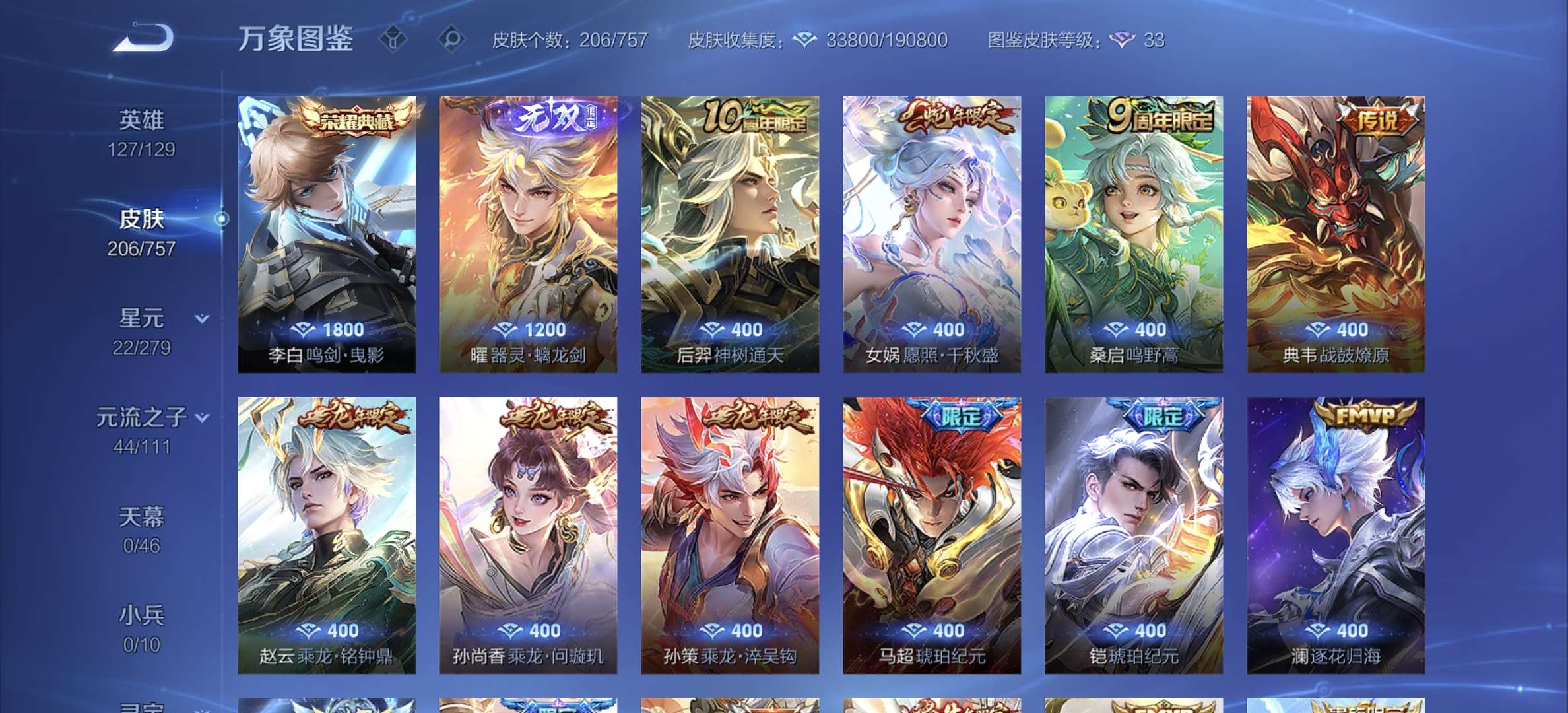 1.2w蚩姹 1w项羽 李白典藏 耀无双 宫本星传说21个传说 纯白花嫁 大圣娶亲等一系列限定皮