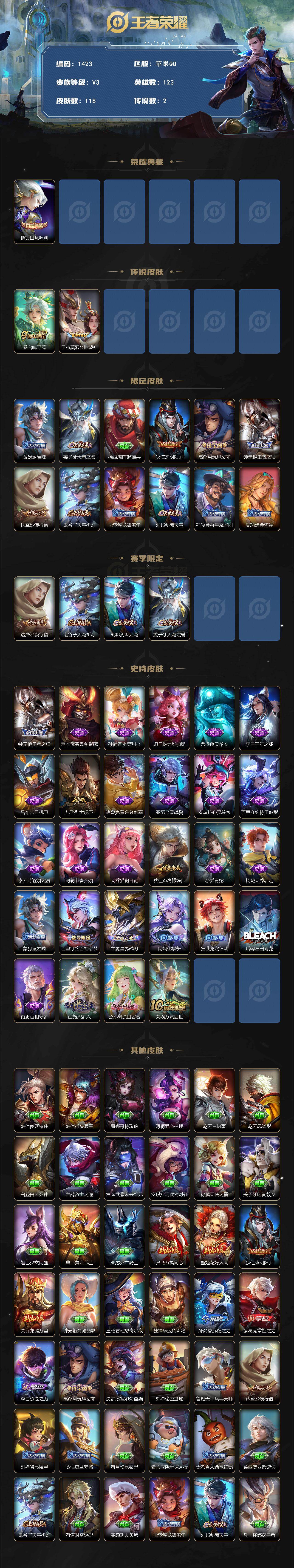 精品小号 铠银白咏叹调 银标阿珂 】苹果Q-V3-最强王者段位-123英雄-118皮肤-1典藏皮肤-2传说-28史诗