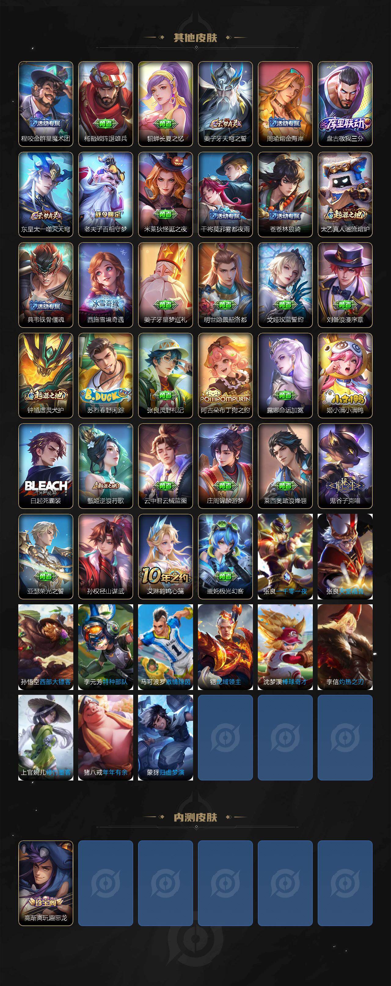 【限定皮肤】:蒙犽顽岩魄,姜子牙天穹之誓,杨戬破阵退雄兵,狄仁杰阴阳师,高渐离玩趣恶龙,钟无艳王者之锤,达摩沙漠行僧,鬼谷子天穹祈灯,沈梦溪龙舞盛年,