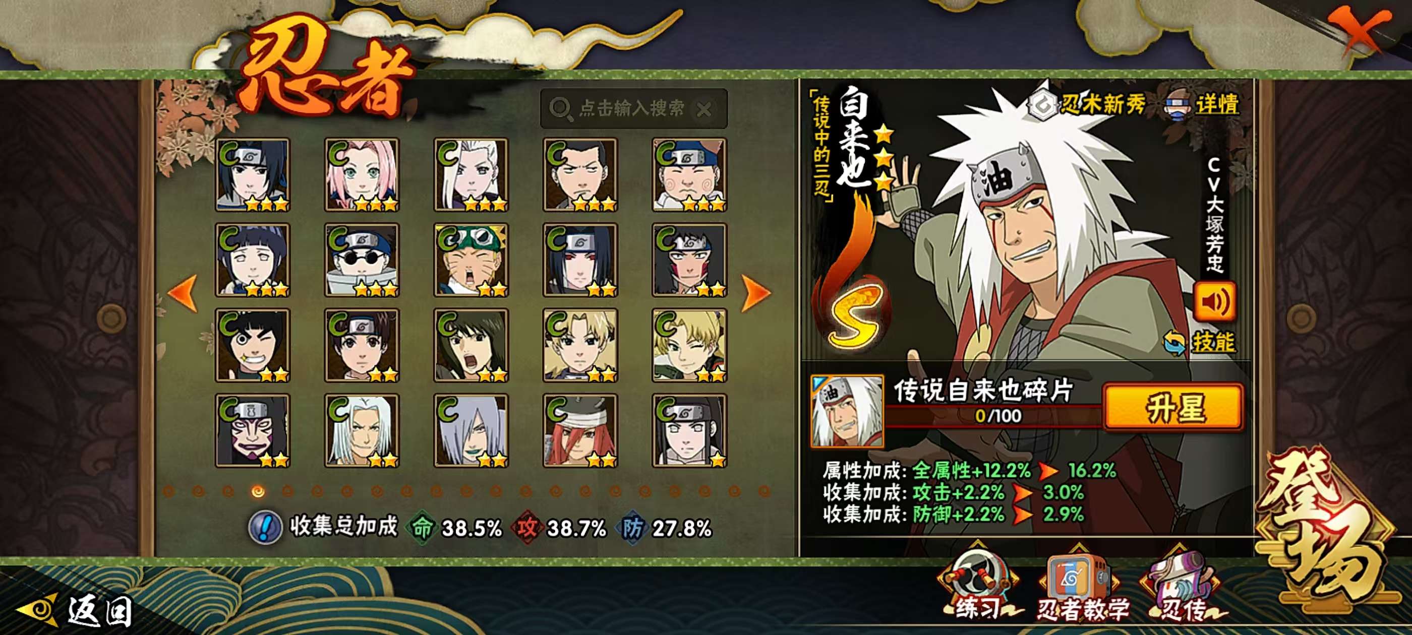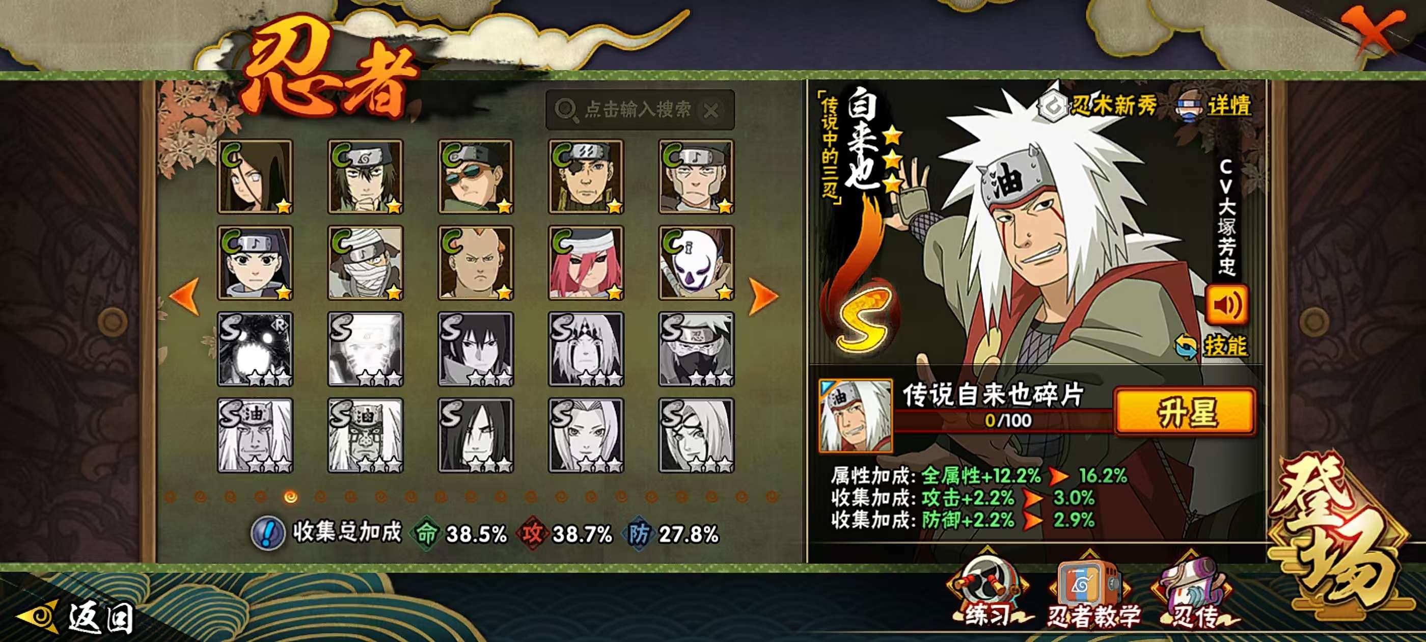 贵七 九十忍者 四个s 二十二a 十六通 有熊猫 秘卷基本满 三级霸体 开了忍法帖可以续 有黑绝