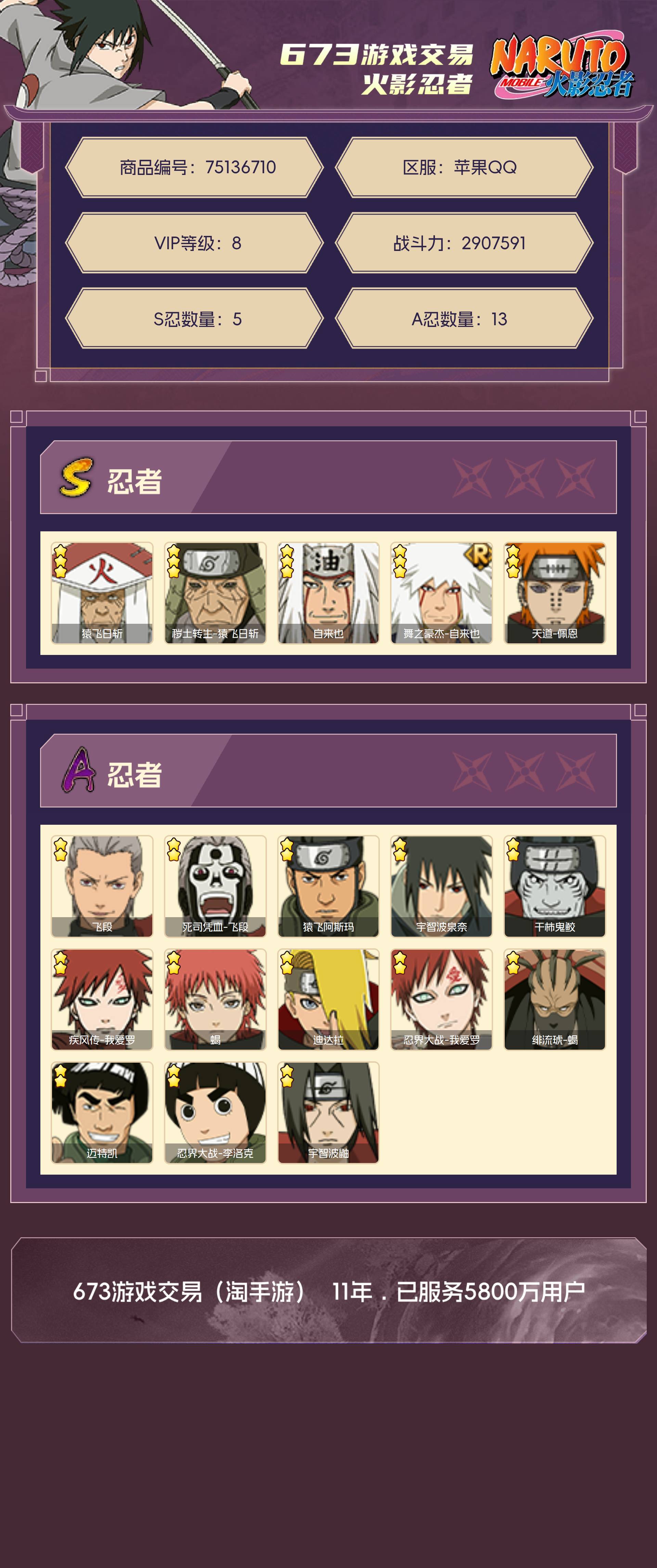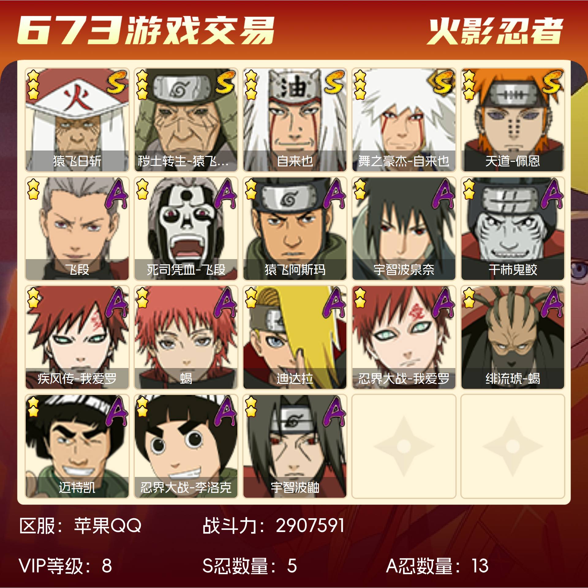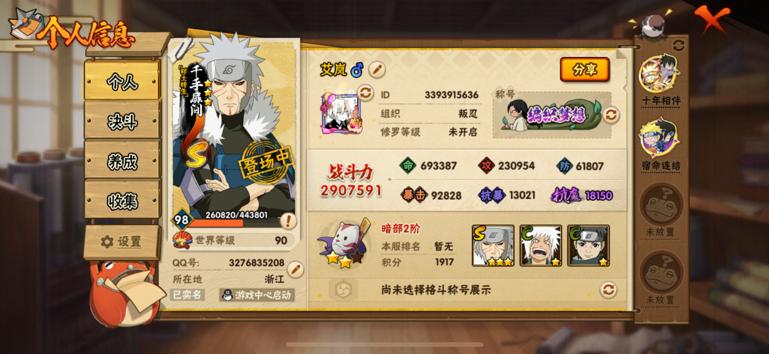 角色等级127 金币994 战斗力2907591 S忍5 A忍13 8 段位暗部