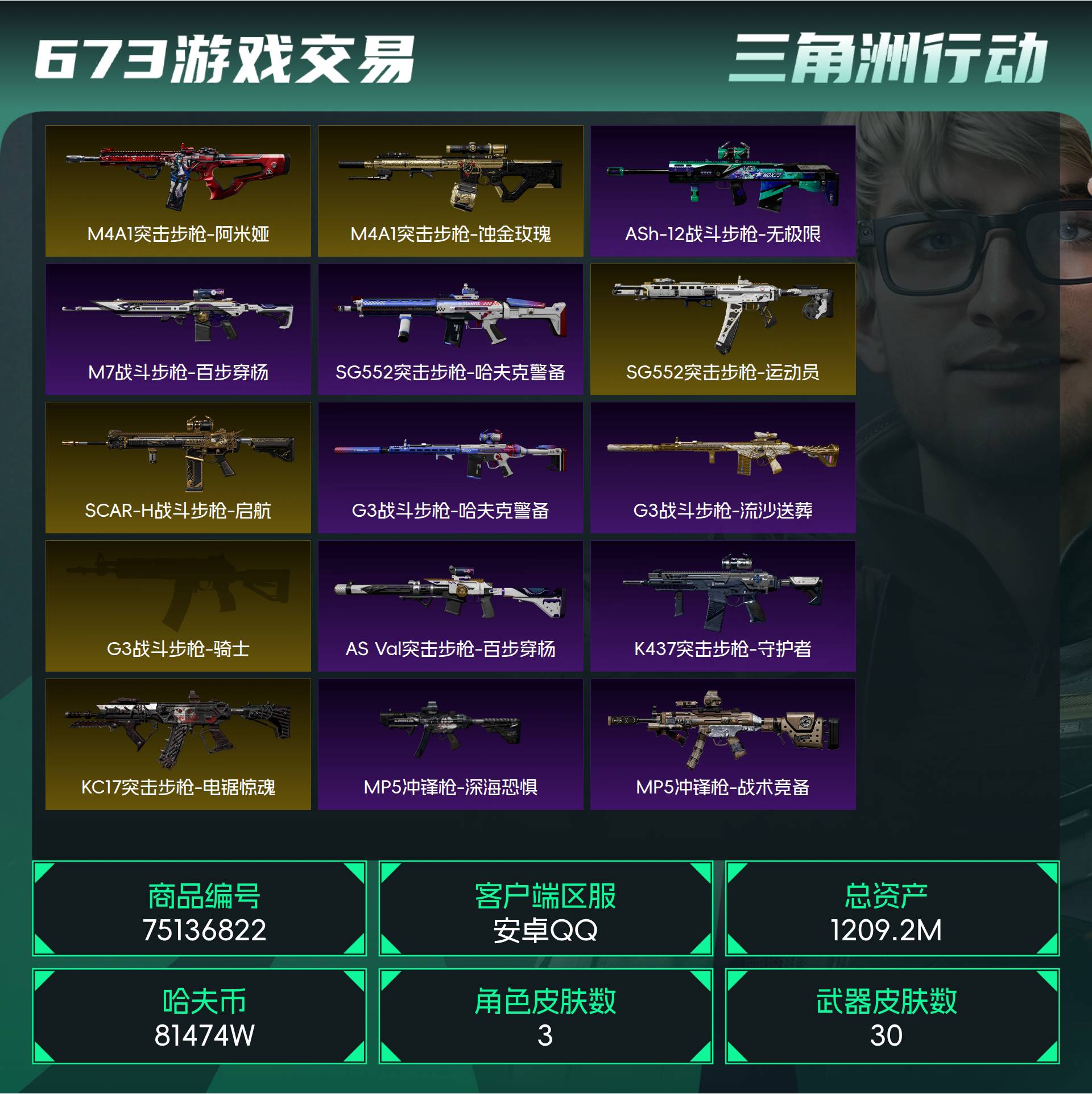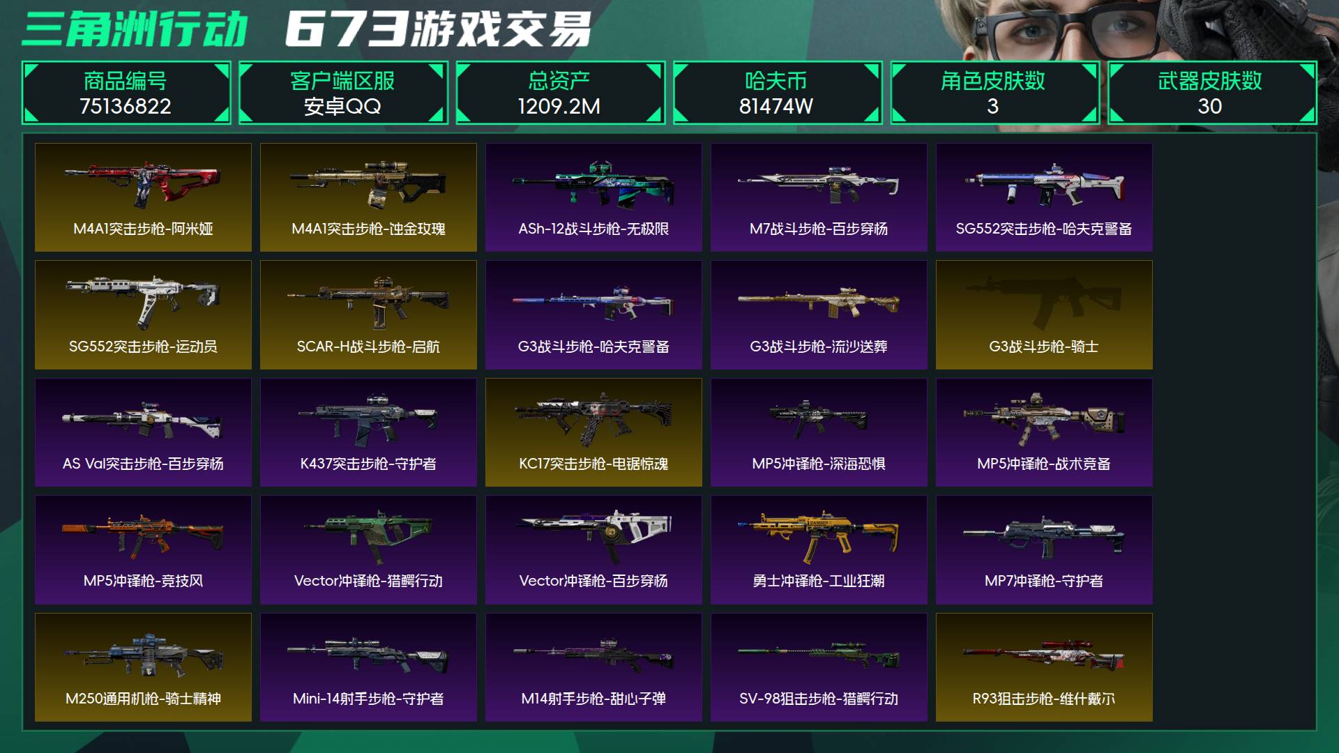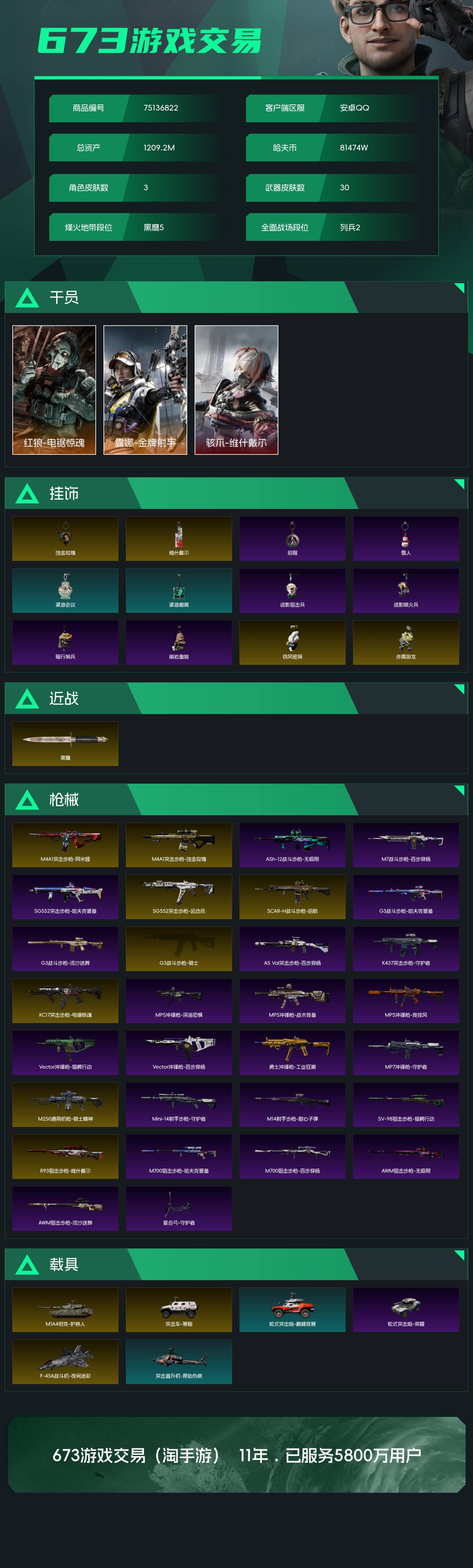 烽火段位黑鹰5 战场段位列兵2 总资产1209.2M 哈夫币81474W 干员3 挂饰12 近战1 枪械30 载具6