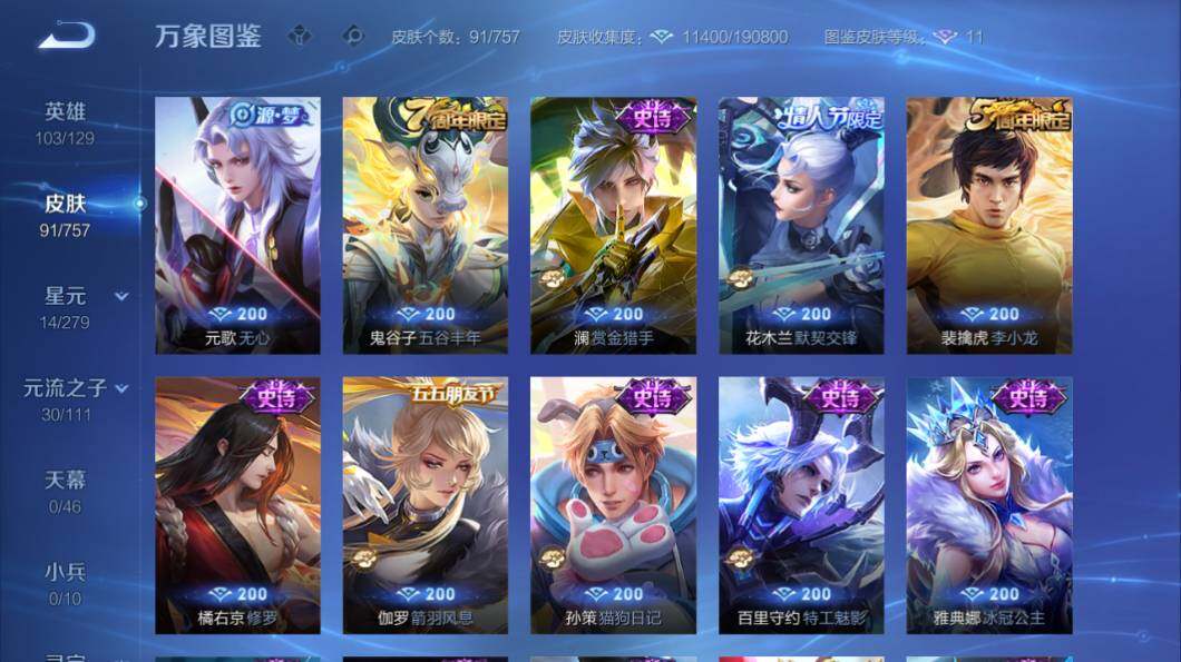 【限定皮肤】:狄仁杰阴阳师,赵云皇家上将,元歌无心,项羽海滩派对,花木兰默契交锋,刘备百相守梦,李元芳云中旅人,鬼谷子五谷丰年,沈梦溪大漠名商,裴擒虎李小龙