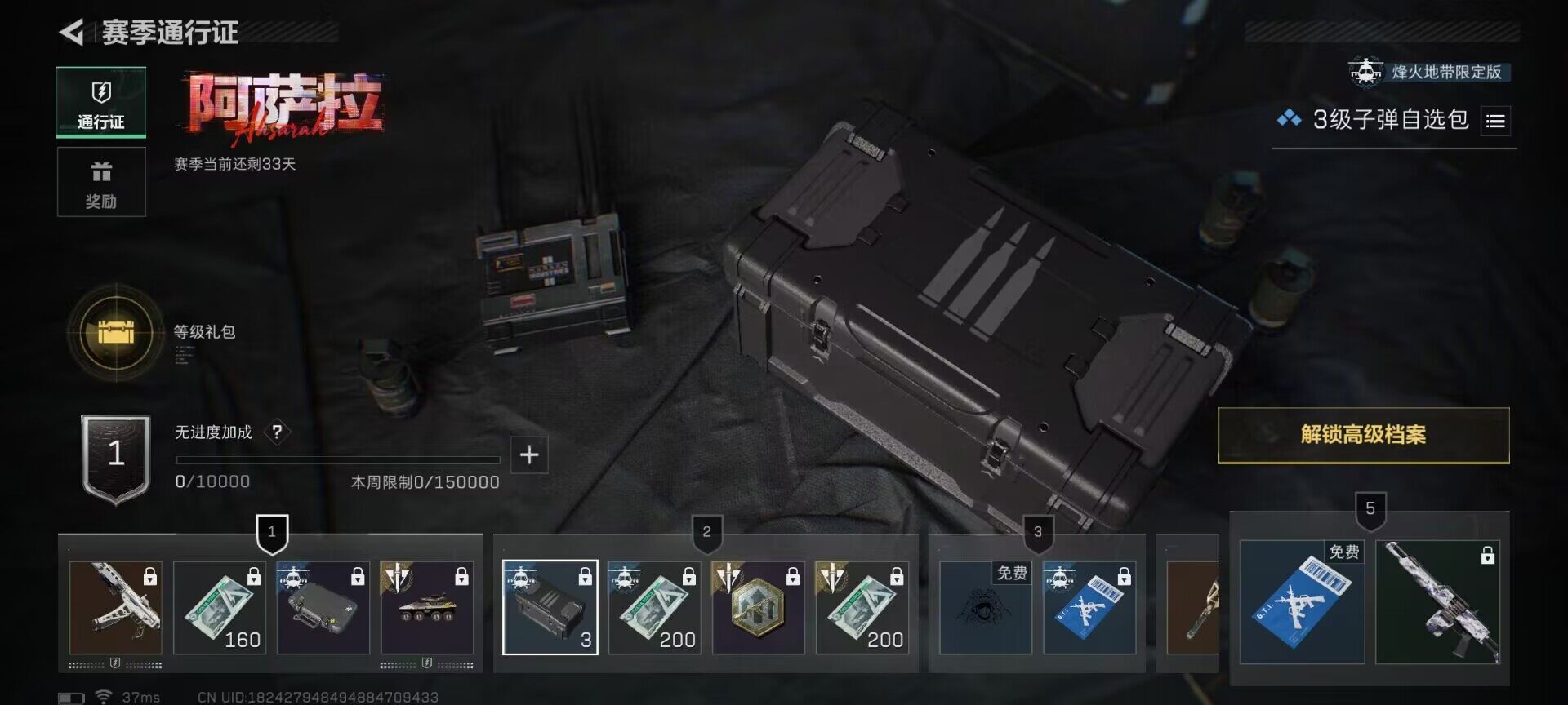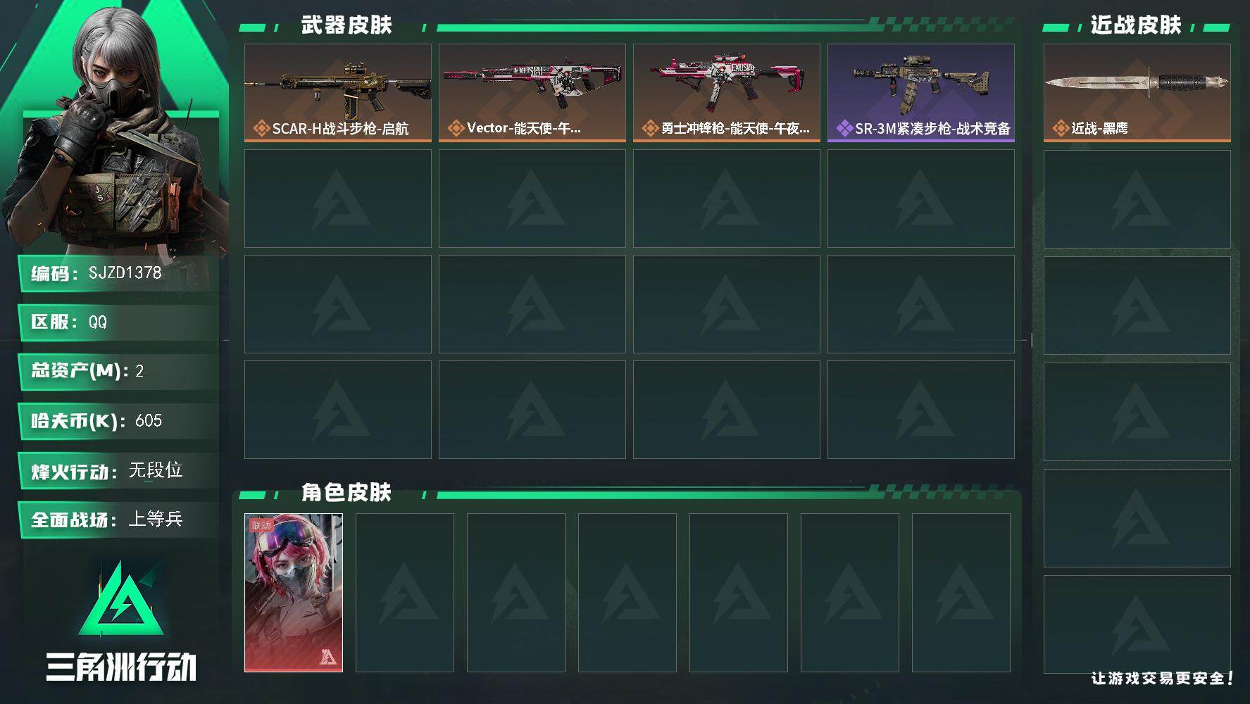 总资产(M):2M/哈夫币(K):605K/传说枪皮数:3/全面战场等级:18_段位:上等兵/烽火地带等级:2_段位:无段位/