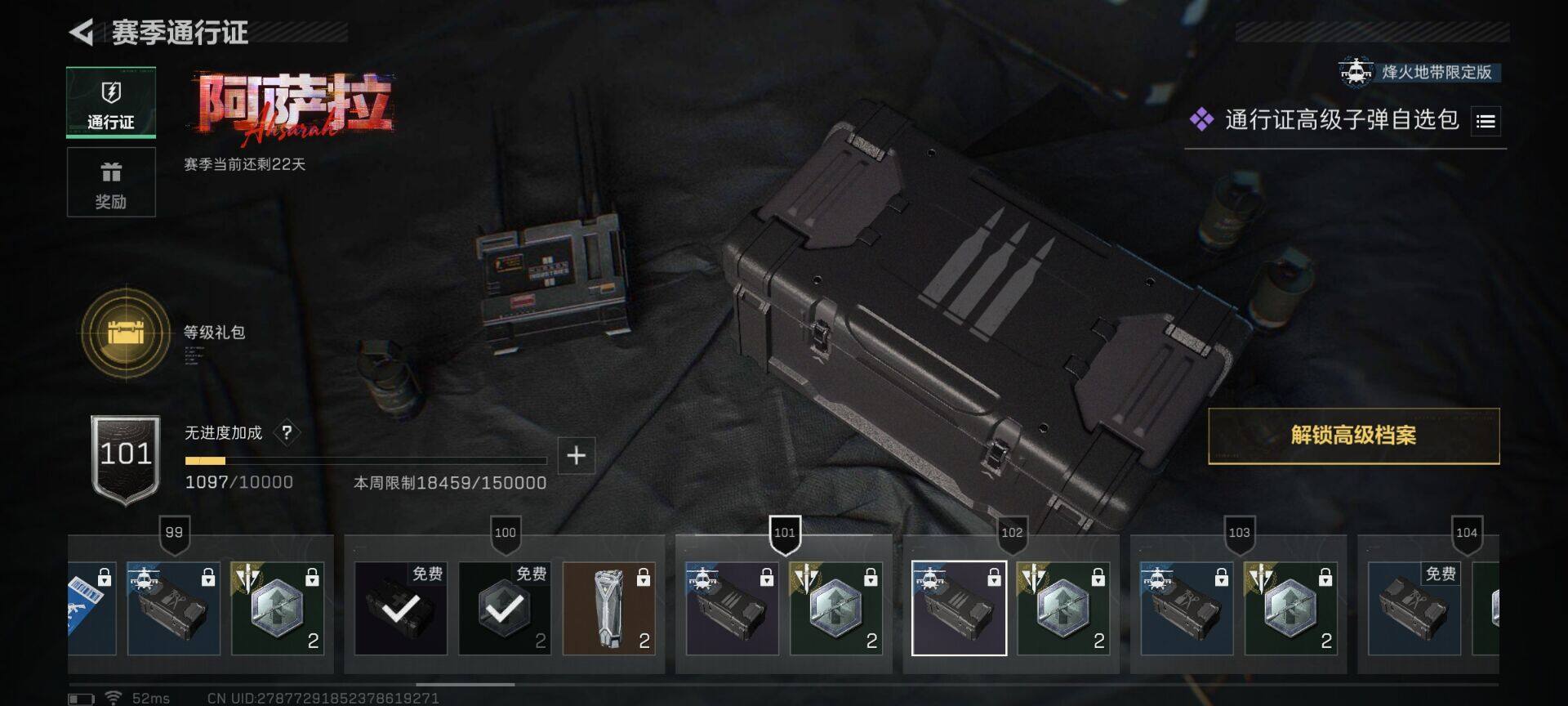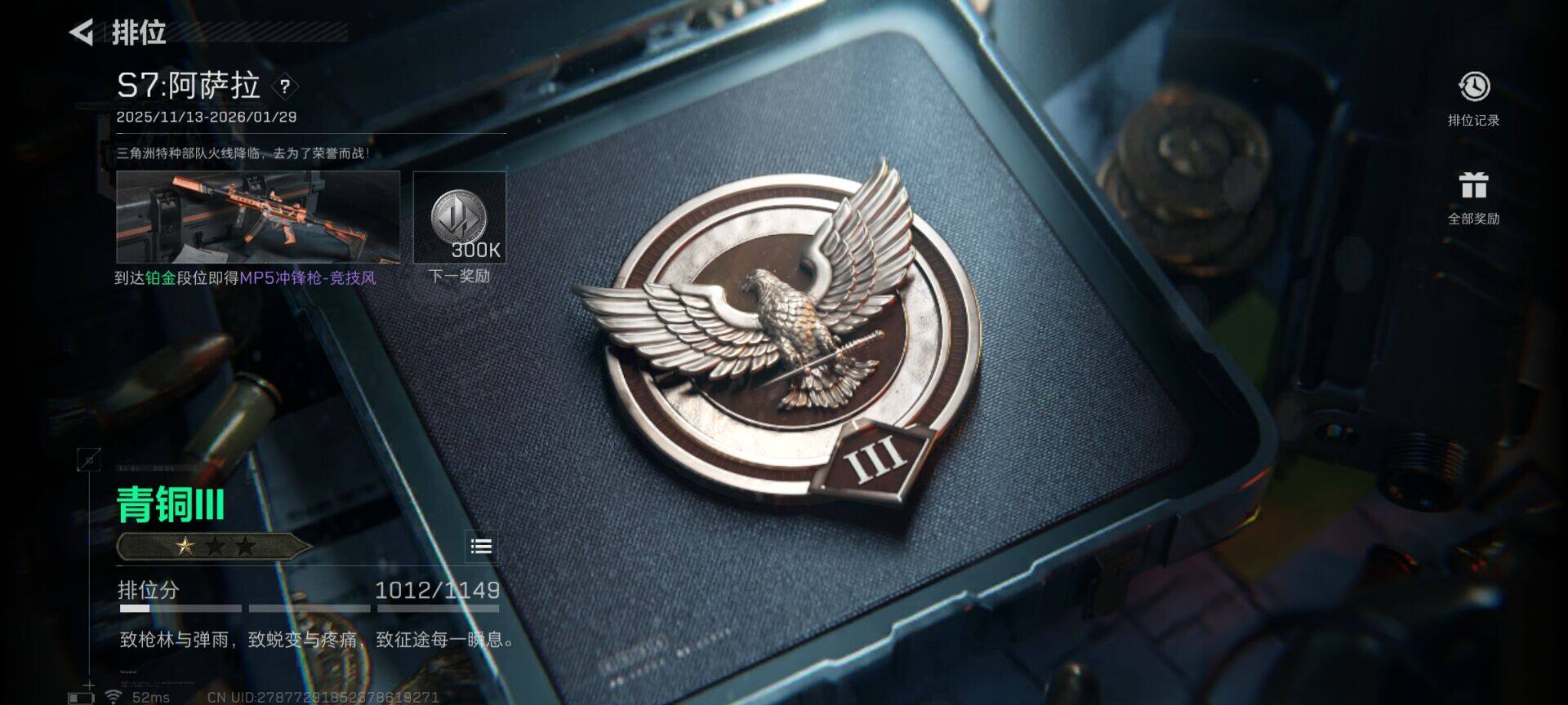 总资产(M):11M/哈夫币(K):1076K/传说枪皮数:3/全面战场等级:1_段位:无段位/烽火地带等级:44_段位:青铜/