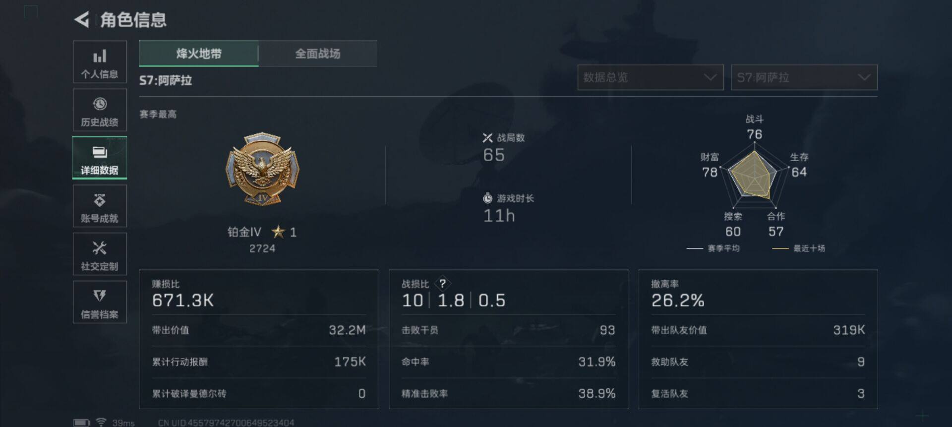 总资产(M):2M/哈夫币(K):318K/传说枪皮数:3/全面战场等级:4_段位:无段位/烽火地带等级:55_段位:铂金/