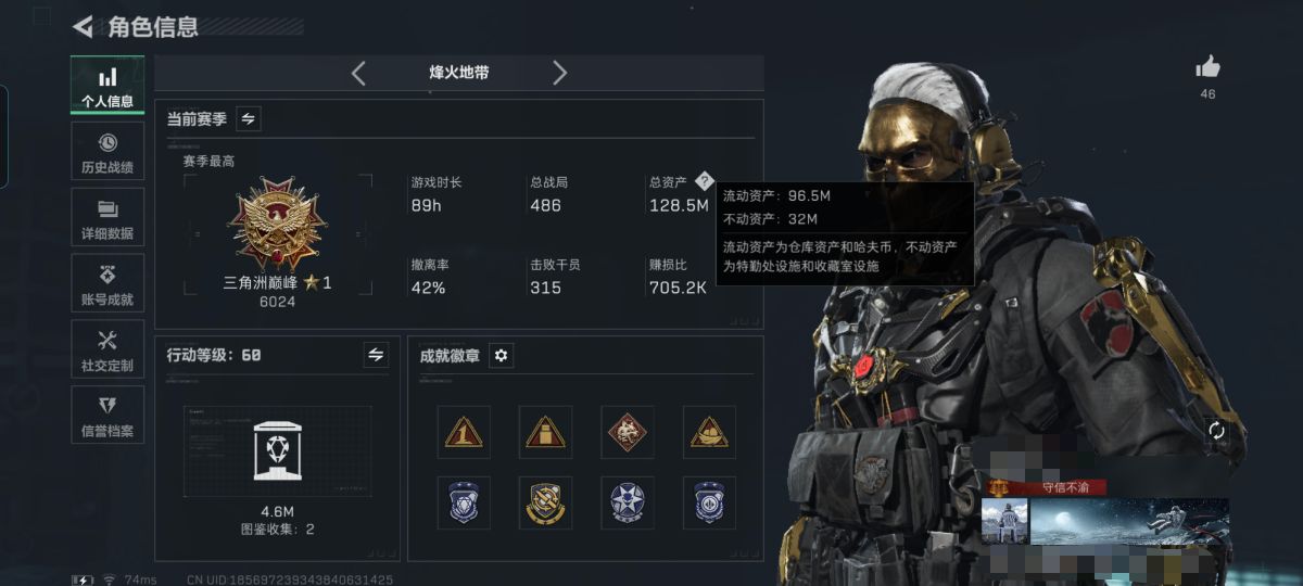 XXSJZ1786【5干员皮 通行证 刀皮电锯惊魂 信条】三端互通-总价值127.6M-哈夫币57266k-烽火地带等级60-烽火地带段位黑鹰【干员皮肤】蜂医-送葬人·无题密令 红狼-电锯惊魂 红狼-蚀金玫瑰 深蓝-不破誓约 露娜-金牌射手【近战武器】黑鹰 电锯惊魂 信条【枪皮】AKS-74U突击步枪-蛇纹涂装 AKS-74U突击步枪-蛇纹涂装 AKS-74U突击步枪-蛇纹涂装 AKM突击步枪-噬菌体 AKM突击步枪-噬菌体 PTR-32徒步几千-噬菌体 M7战斗步枪-噬菌体 M7战斗步枪-噬菌