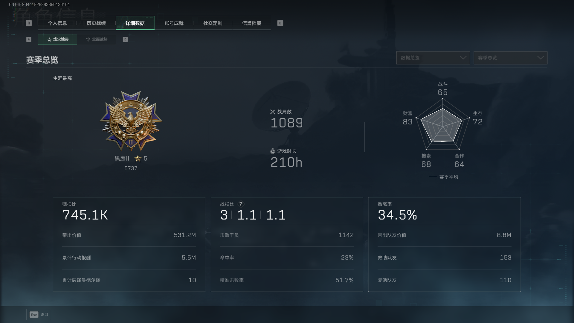 DSJZ1580【总资产(M)】175.81【哈夫币】19,027.12【行动等级】60【全面战场等级】50