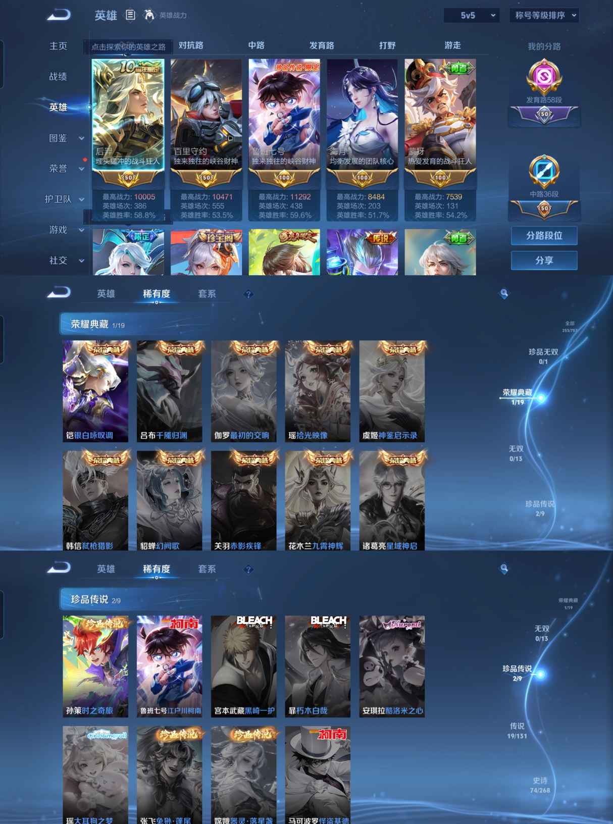 MWZ104448【v7 典藏1 珍品传说2 传说19 星传说1 时之思念 发育路58段 5金标3万战 后裔10005战力 百里守约10471战力 鲁班七号11292战力】安卓Q-253皮肤-127英雄 【珍品传说】 江户川柯南 时之奇旅 【典藏皮肤】 银白咏叹调 【传说皮肤】 神树通天 牧神诗旅 鸣野蒿 遇见神鼓 逐花归海 琥珀纪元 幻光神枪 愿照·山河定 愿照·九州拓 万灵伏威 超时空战士 祈雪灵祝 黄金射手座 绛天战甲 胖达荣荣 末日机甲 零号·赤焰 游龙清影 音你心动