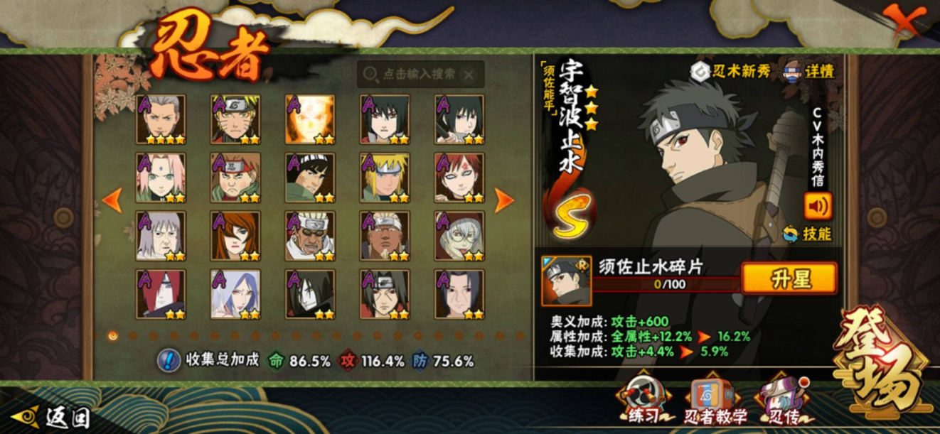 【S级忍者】宇智波带土「忍界大战」(3星),迈特凯「死门」(3星),宇智波斑「秽土转生·解」(3星),宇智波佐助「永恒万花筒」(3星),宇智波止水「须佐能乎」(3星),漩涡鸣人「九喇嘛连结」(3星),宇智波斑「白面具」(3星),千手扉间「秽土转生」(3星),宇智波斑「秽土转生」(3星),波风水门「秽土转生」(3星)