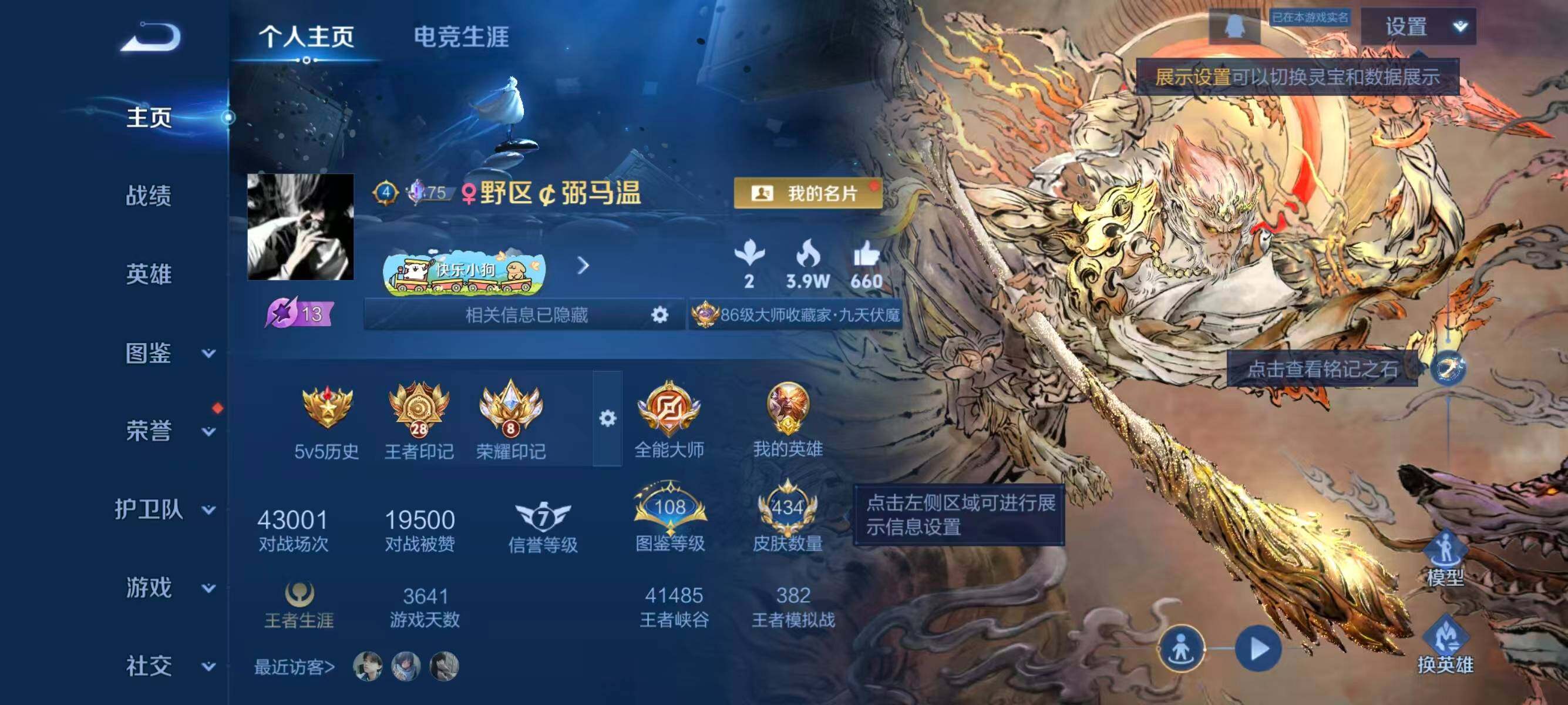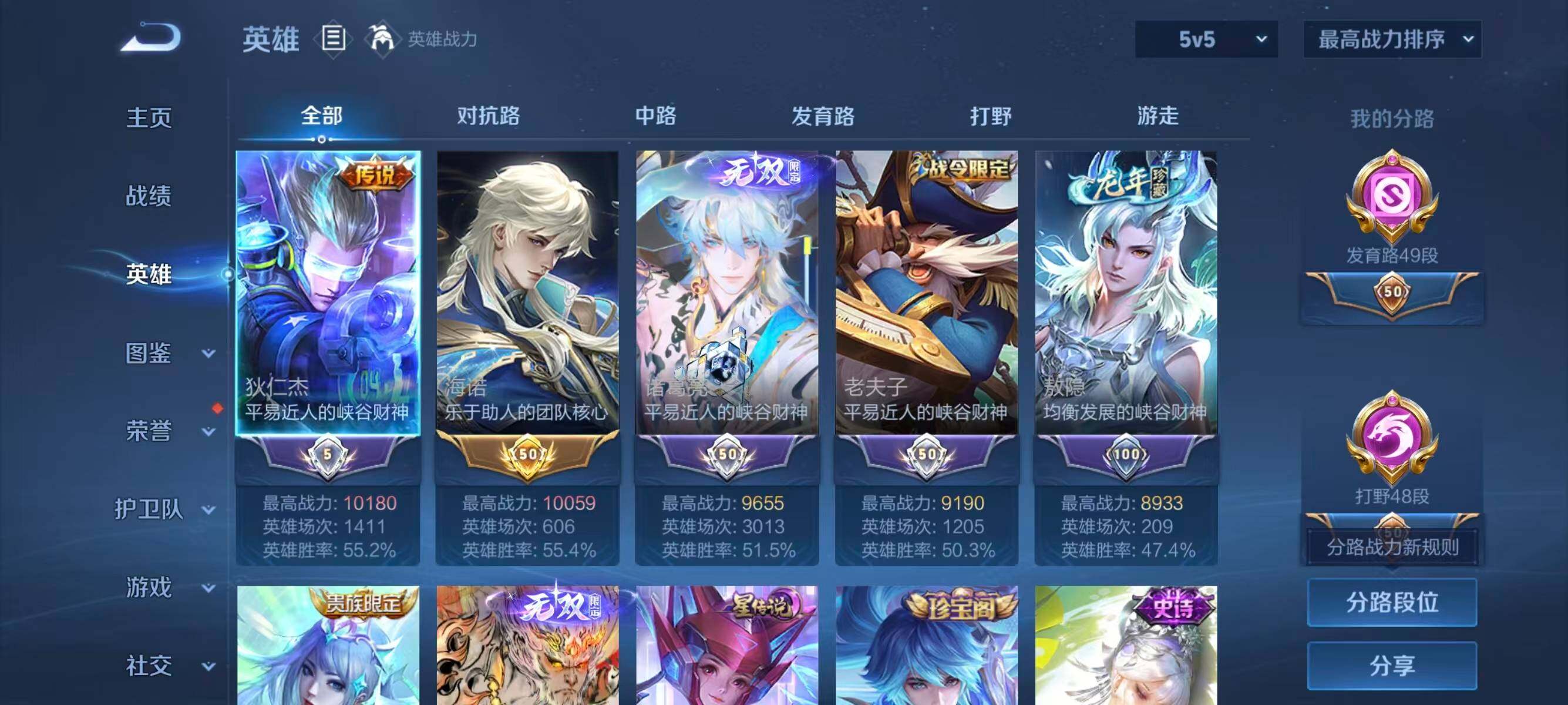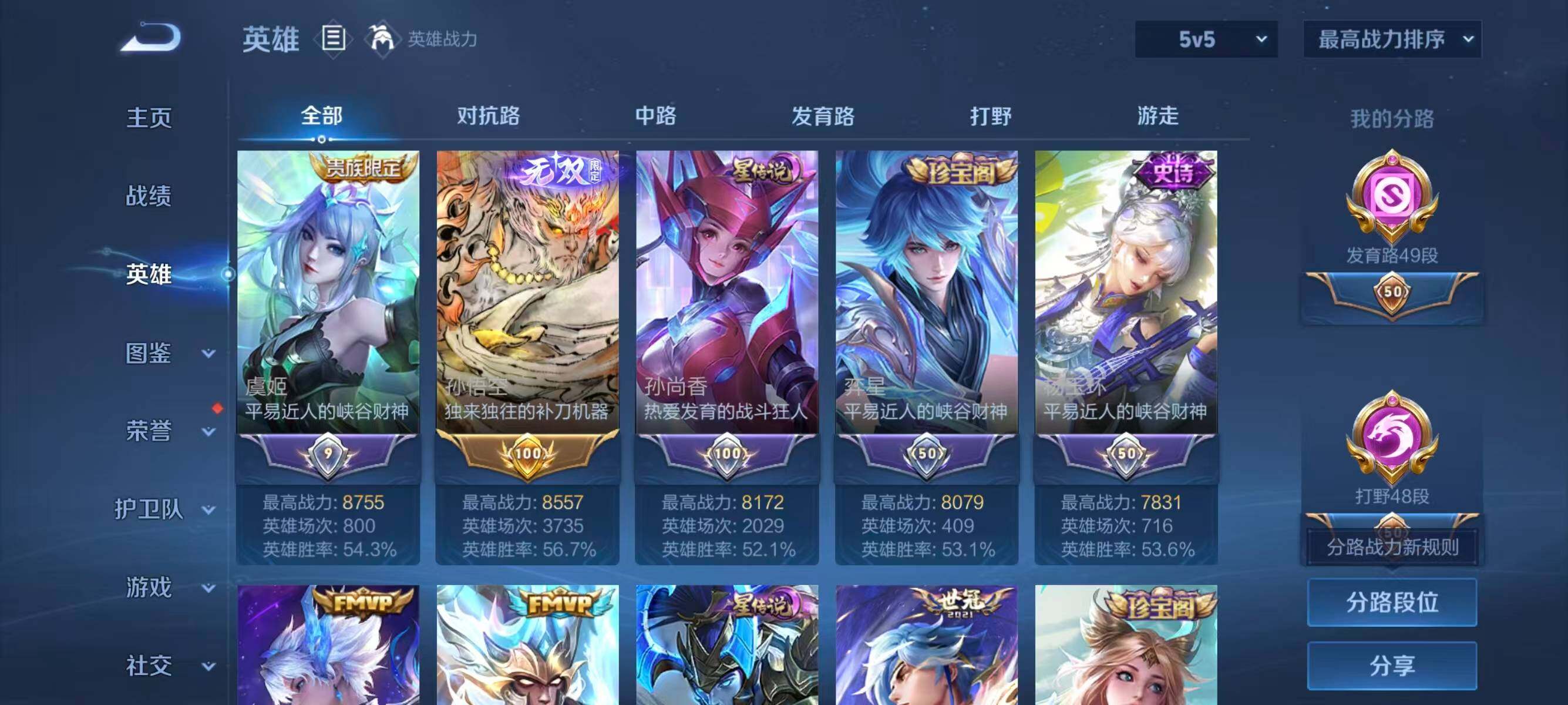 V9/发育路49段/打野48段/万战金标海诺/金标孙悟空/万战狄仁杰/434皮肤5典藏皮肤5无双30传说