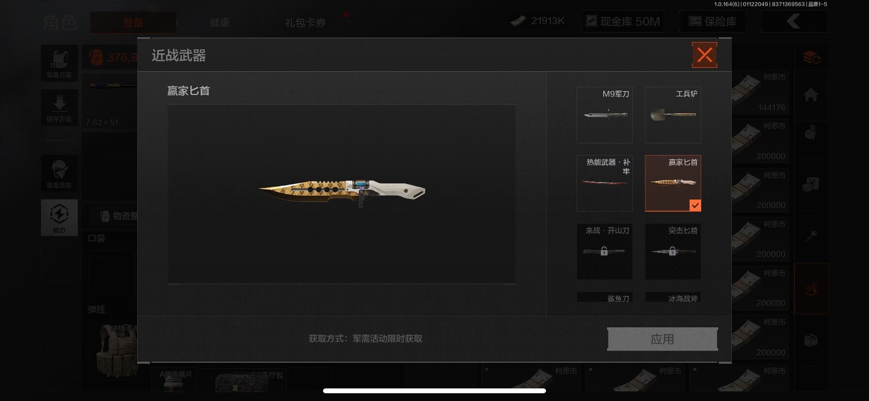 【AQZG964】等级:30/段位:新锐/仓库价值(百万):186.4/柯恩币:50000000/热能武器补牢/赢家匕首