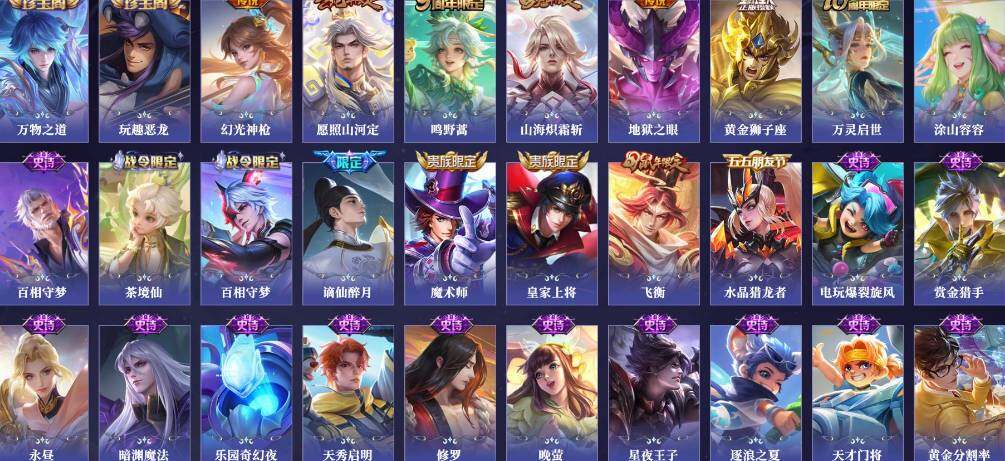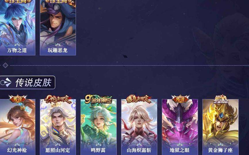 【传说皮肤】:司空震愿照山河定,云缨幻光神枪,桑启鸣野蒿,李信山海炽霜斩,达摩黄金狮子座,宫本武藏地狱之眼