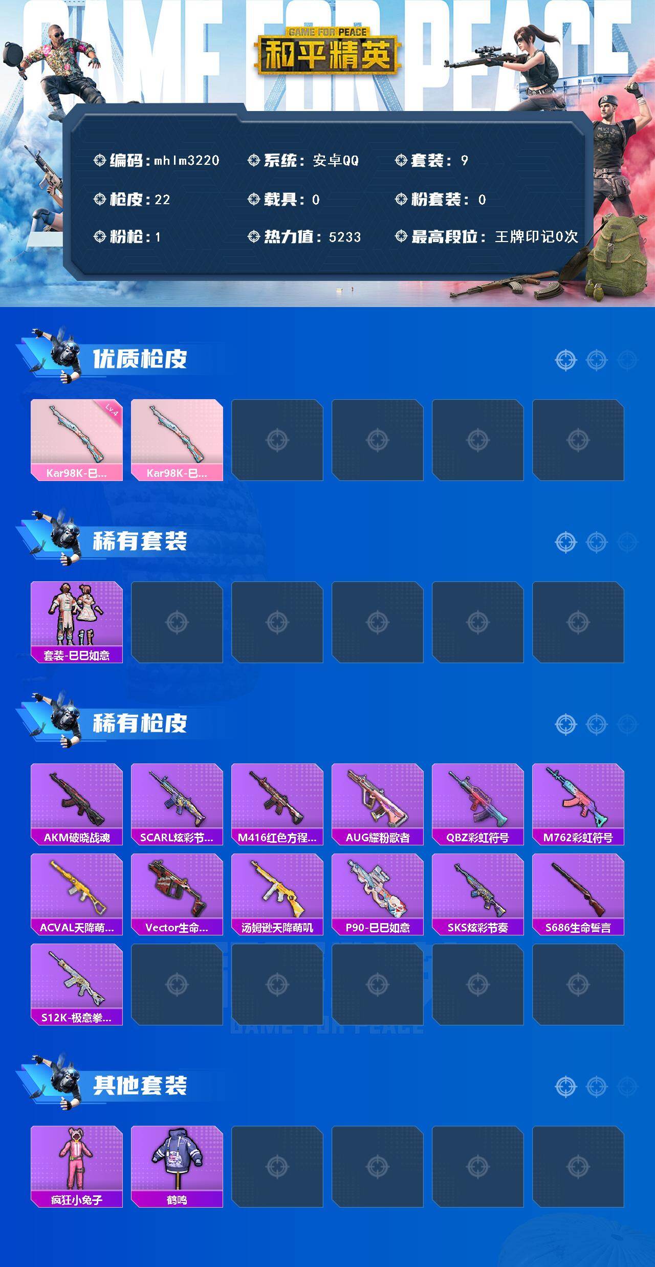 【mhlm3220】安卓 手Q-0粉装-1特效枪-0载具-1粉色飞行器-5233热力值-0王牌印记-9套装-22枪皮