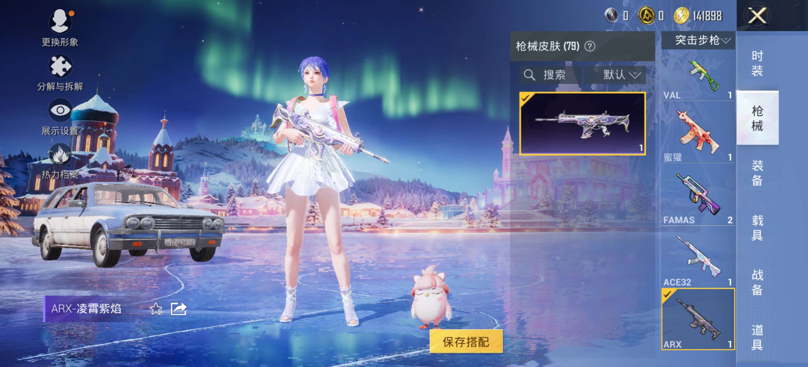 【稀有枪皮】:AUG-冰晶雪宝,AKM-破晓战魂,SCAR-L-炫彩节奏,M416-红色方程式,AUG-耀粉歌者,
