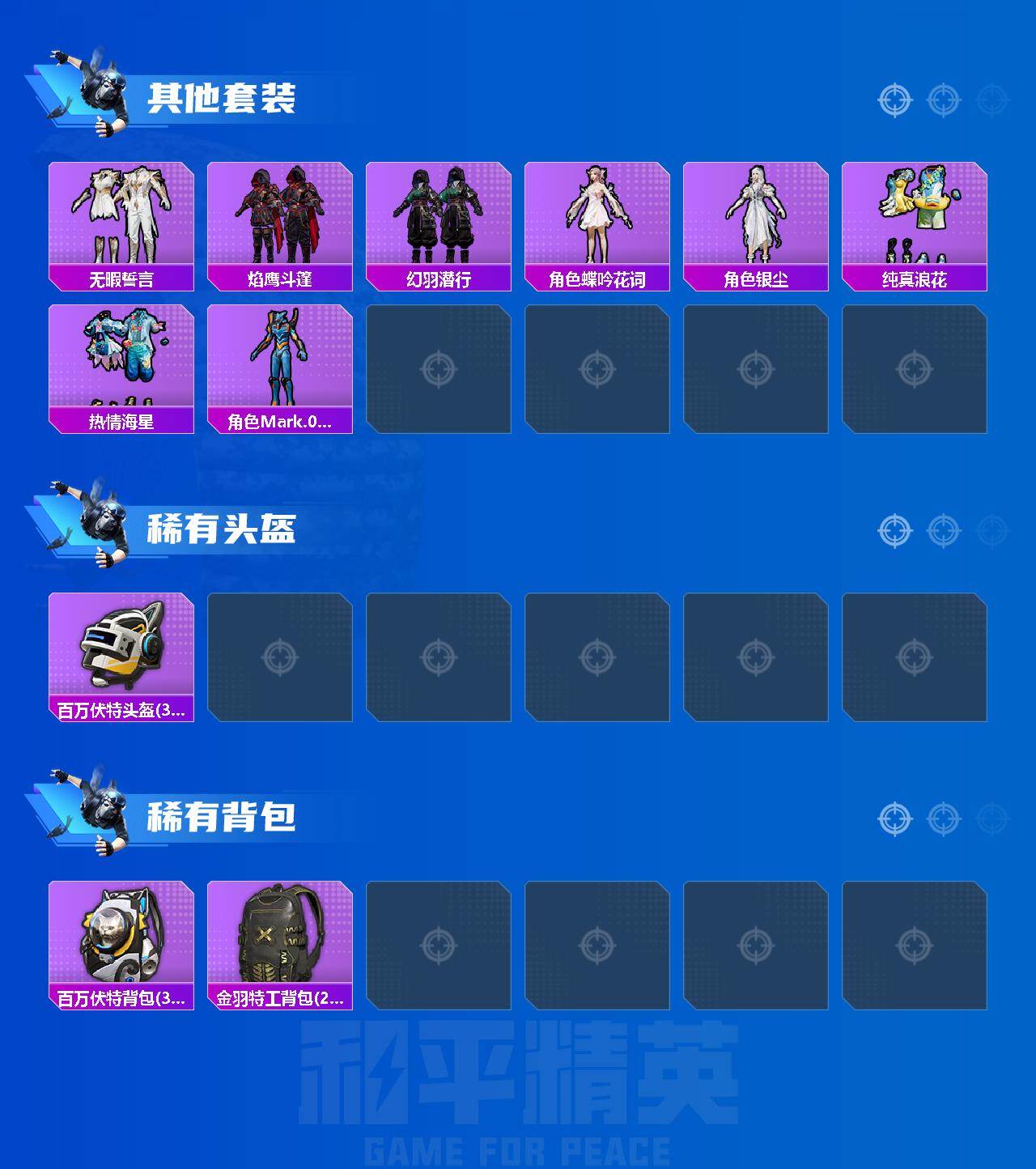 苹果【小号/蓝螳螂/百万伏特背包(3级)】 手Q-3粉装-6特效枪-1载具-0粉色飞行器-47791热力值-8王牌印记-106套装-163枪皮