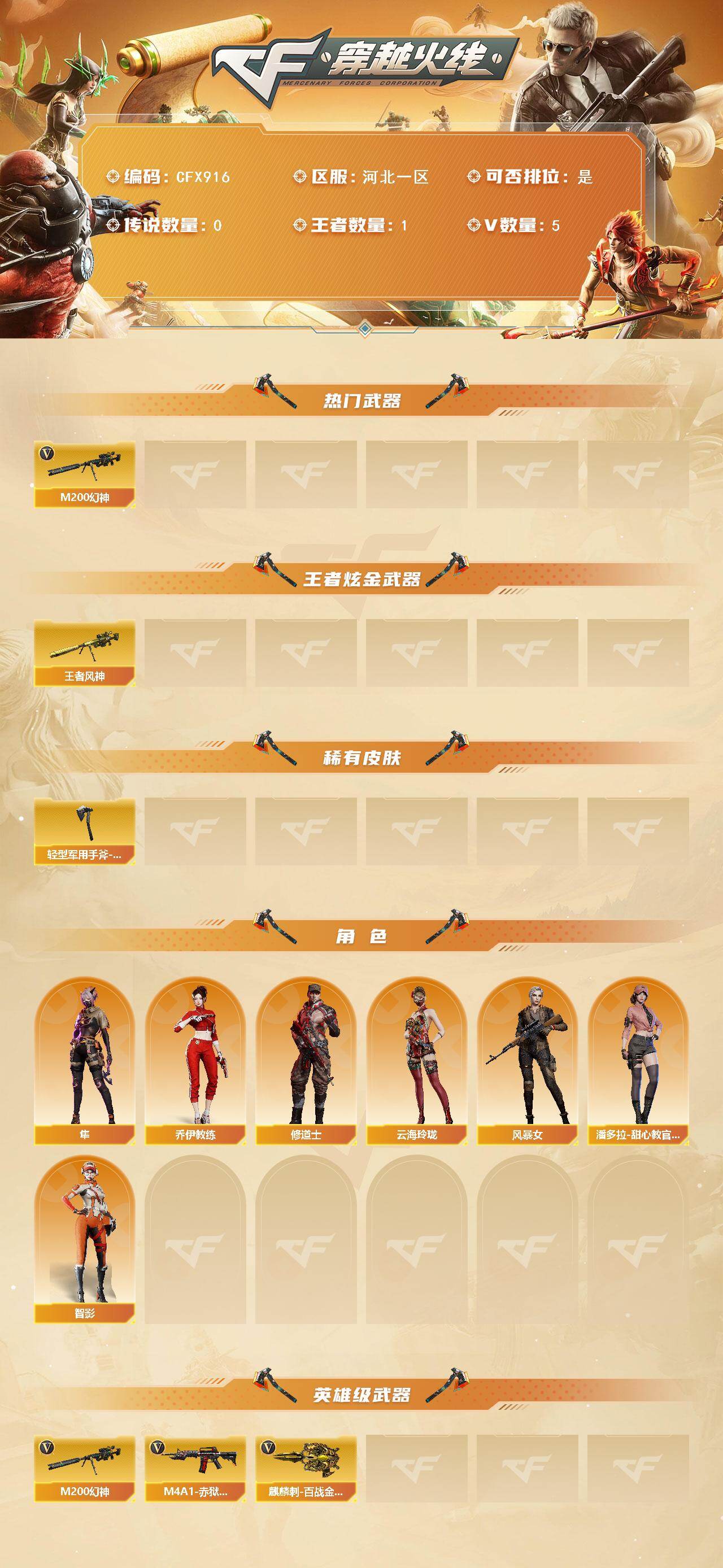 【CFX916】3V/52级/校官/1王者/2英雄/M200_幻神/王者风神/轻型军用手斧-再燃火线/隼/乔伊教练/修道士/云海玲珑/风暴女/潘多拉-甜心教官/智影/麒麟刺-百战金芒/M4A1-赤狱骑士/亚洲杯纪念炫彩背包/女皇终结者-魔龙之吻/绿色巨人/灵魂忍者/迷雾幽灵/夺命之镰/防化服/流光-鎏金之域/枪王排位29赛季金色流光/语音特效-盛典烟火/防弹头盔/防弹衣/C4工具钳/手雷包