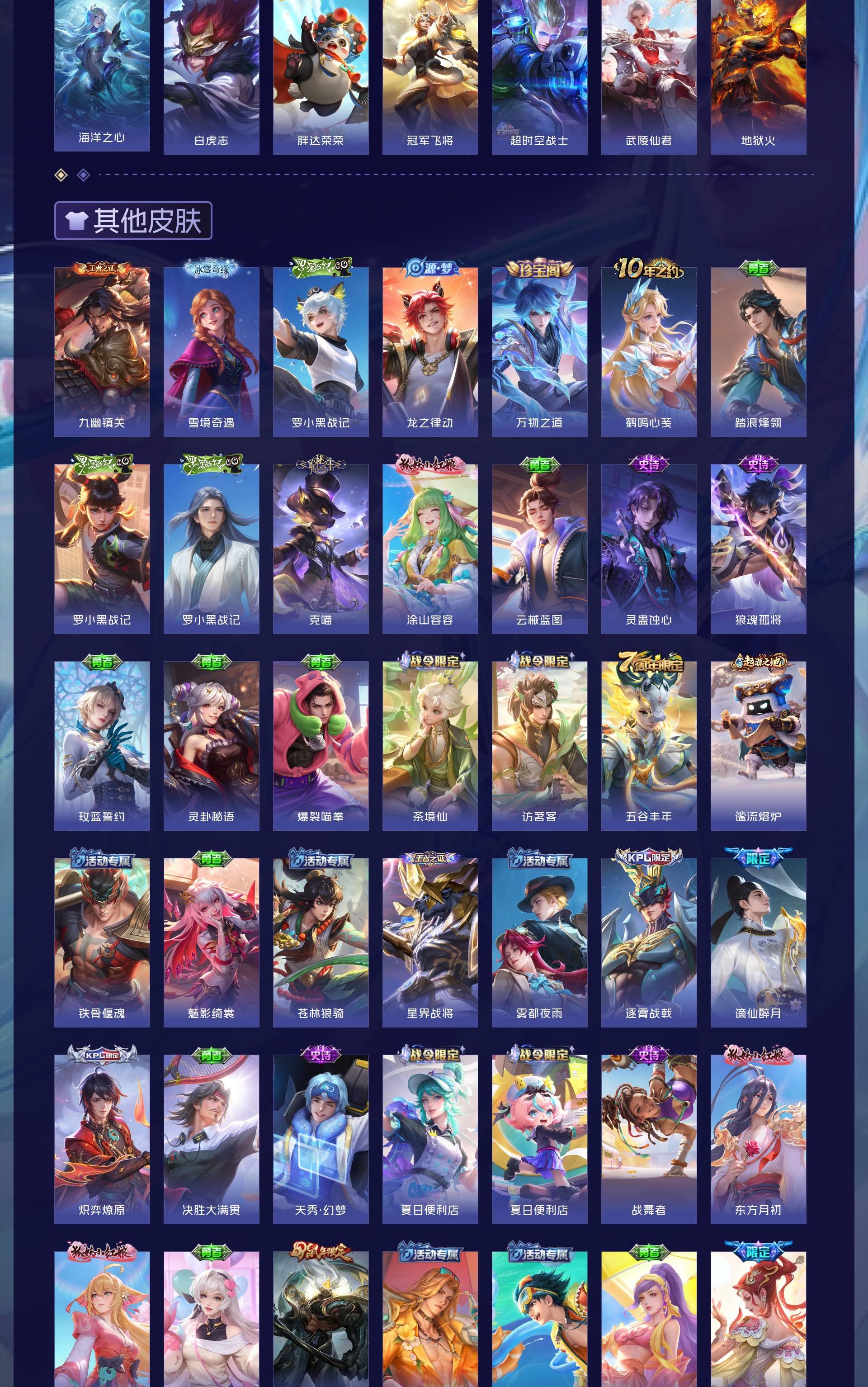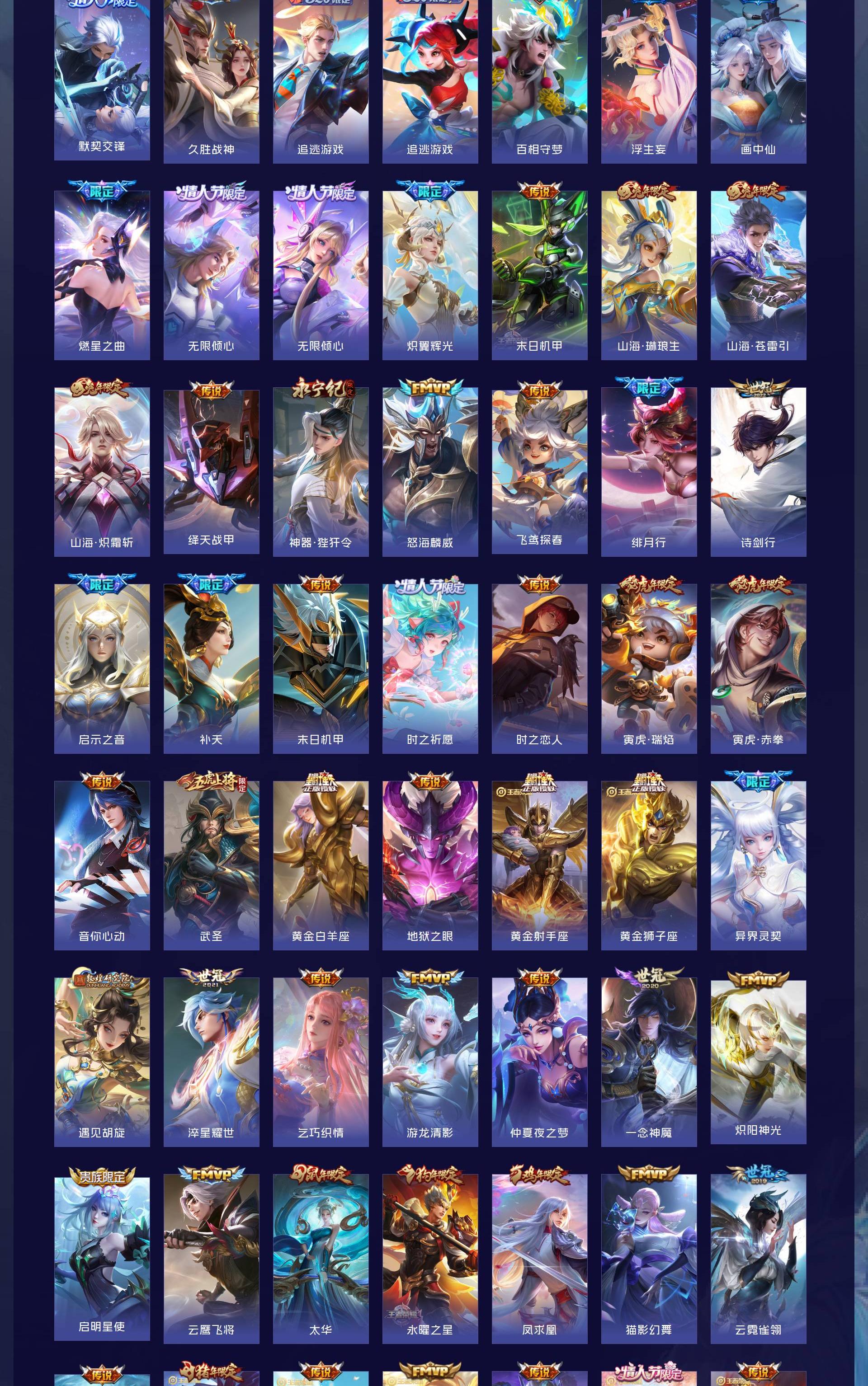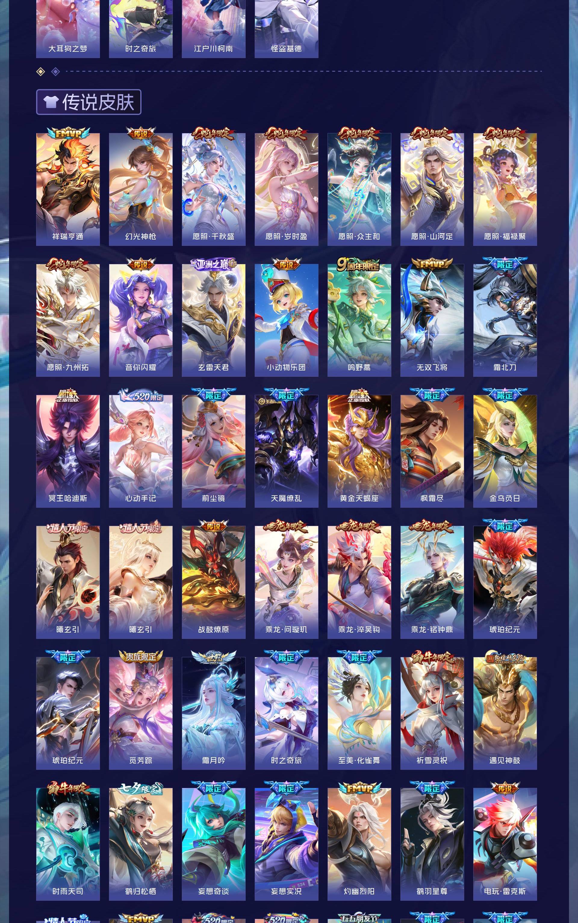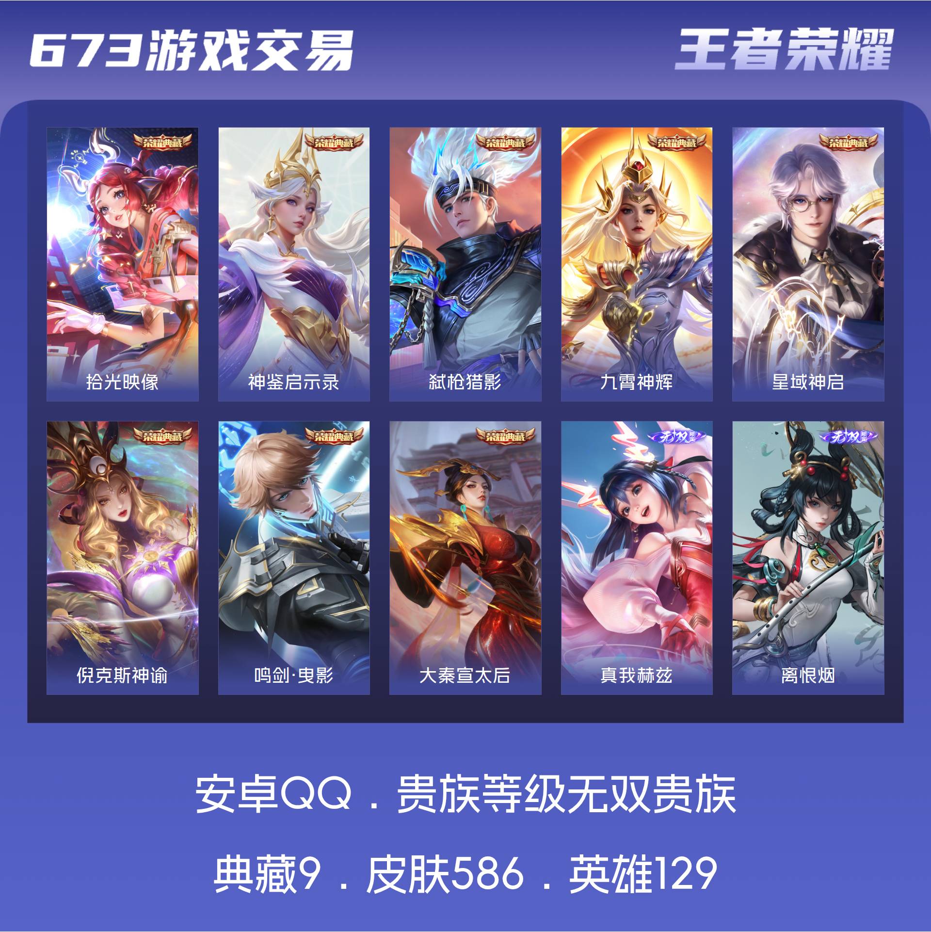 无双贵族 皮肤586 英雄129 至尊星耀 荣耀典藏9 无双皮肤8 珍品传说4 传说99 其他皮肤472