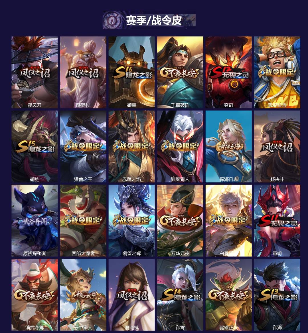 【传说皮】黄金射手座,地狱火,仲夏夜之梦(大飞蛾),海洋之心,地狱之眼,末日机甲-孙尚香(绿蚂蚱),冠军飞将,久胜战神,猫影幻舞,超时空战士-狄仁杰