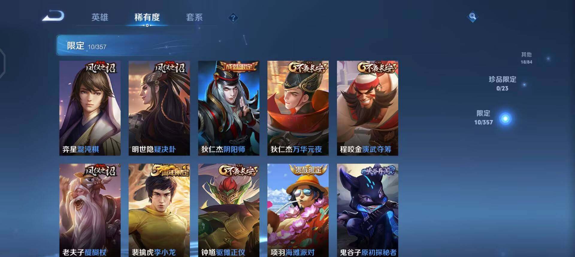 【限定皮肤】:狄仁杰阴阳师,狄仁杰万华元夜,项羽海滩派对,老夫子醍醐杖,程咬金演武夺筹,钟馗驱傩正仪,鬼谷子原初探秘者,弈星混沌棋,明世隐疑决卦,裴擒虎李小龙