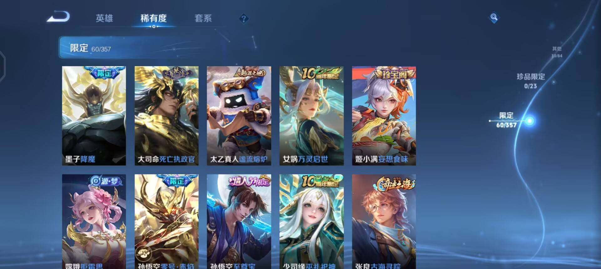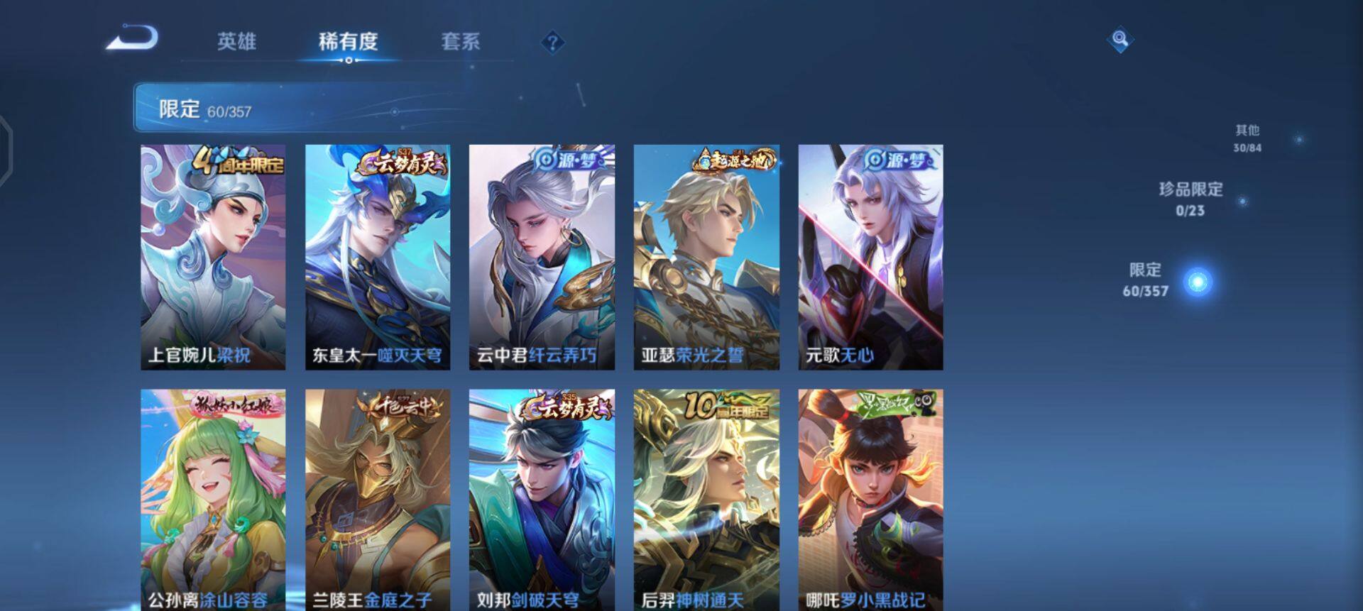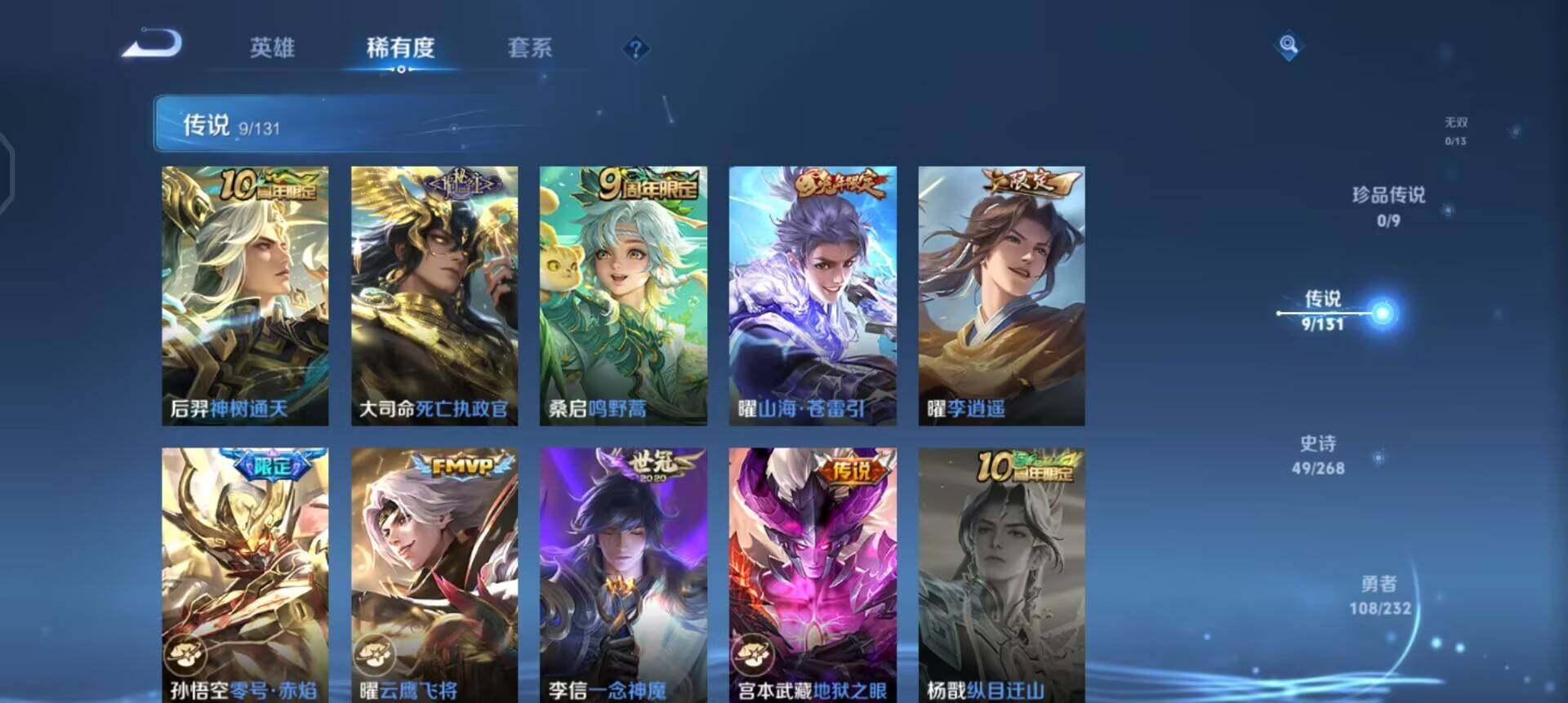 【传说皮肤】:后羿神树通天,大司命死亡执政官,桑启鸣野蒿,曜山海苍雷引,曜李逍遥 ,孙悟空零号赤焰,曜云鹰飞将,李信一念神魔,宫本武藏地狱之眼