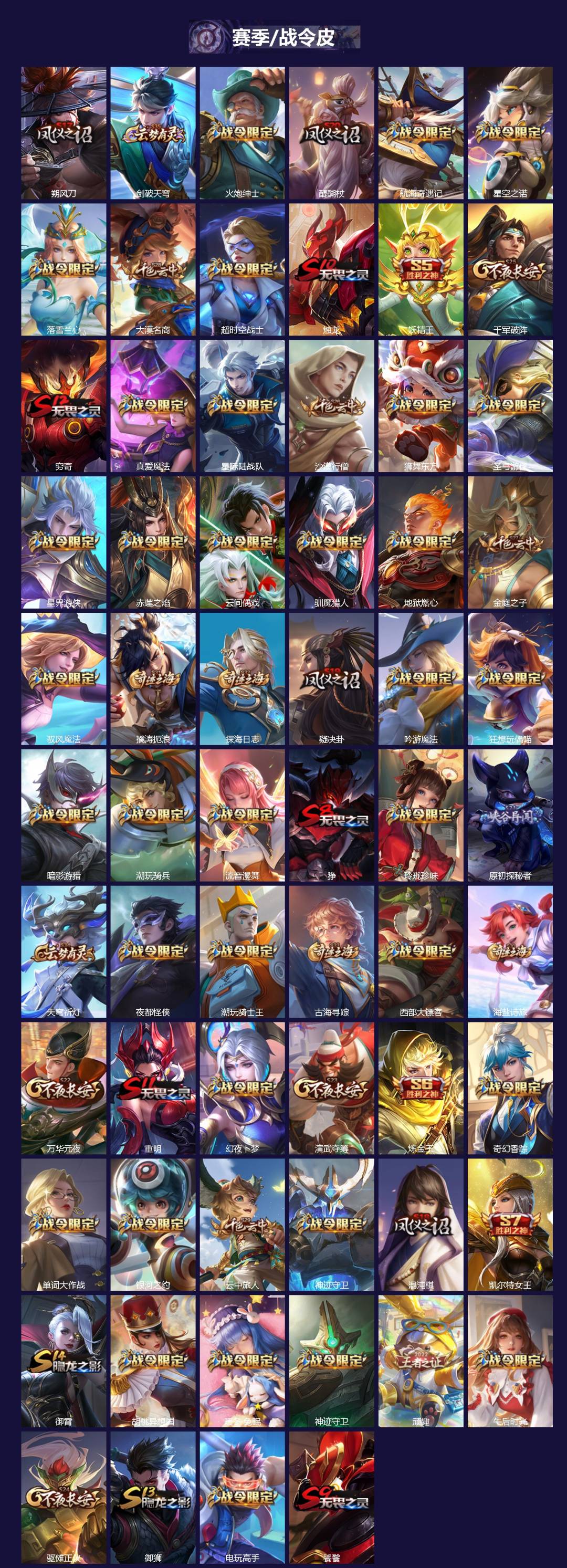【传说皮】:地狱火,仲夏夜之梦(大飞蛾),海洋之心,末日机甲-孙尚香(绿蚂蚱),云霓雀翎,一念神魔,淬星耀世,冠军飞将,云鹰
