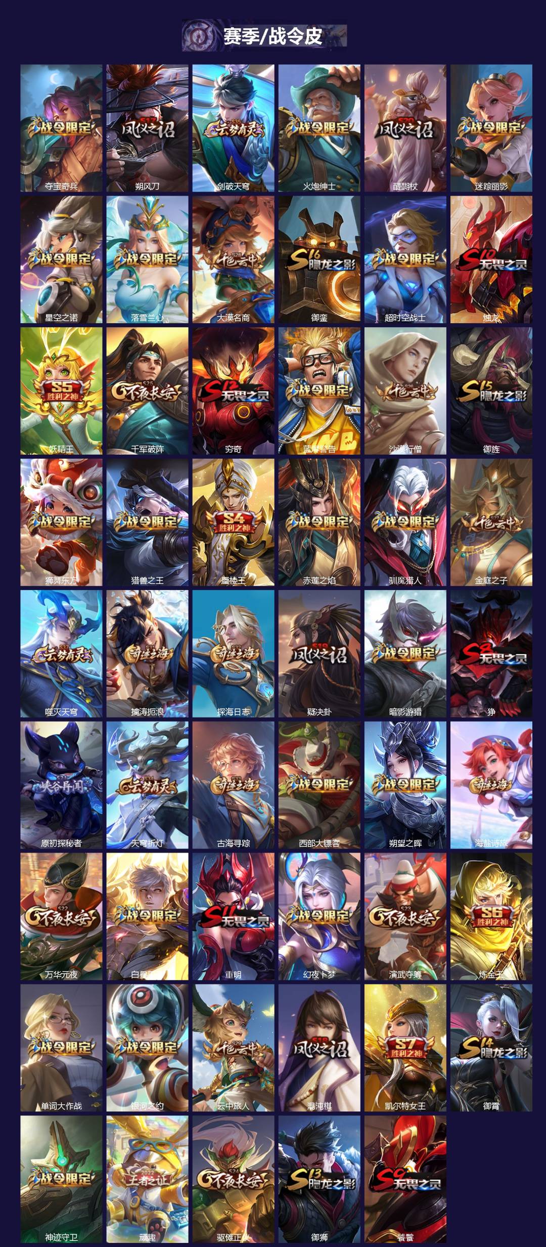 【传说皮】黄金狮子座,黄金射手座,地狱火,仲夏夜之梦(大飞蛾),海洋之心,地狱之眼,末日机甲-孙尚香(绿蚂蚱),一念神魔,久胜战神,云鹰飞将(小将军),末日机甲-孙策