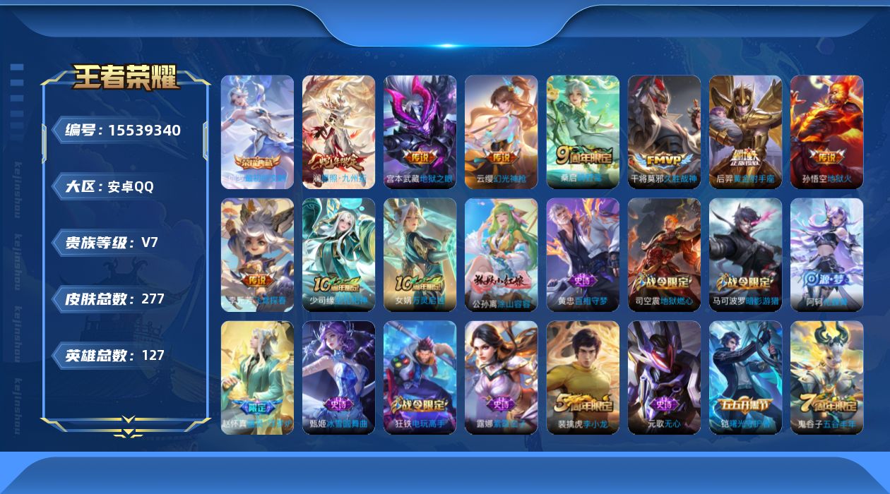 [15539340]V7 1典藏 9传说 127英雄 277皮肤 可修改实名