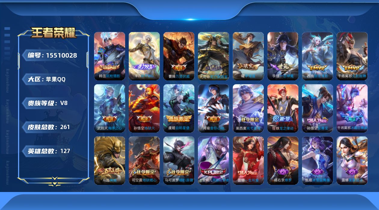[15510028]V8 1典藏 1无双 10传说 127英雄 261皮肤 典藏英雄武则天 可修改实名
