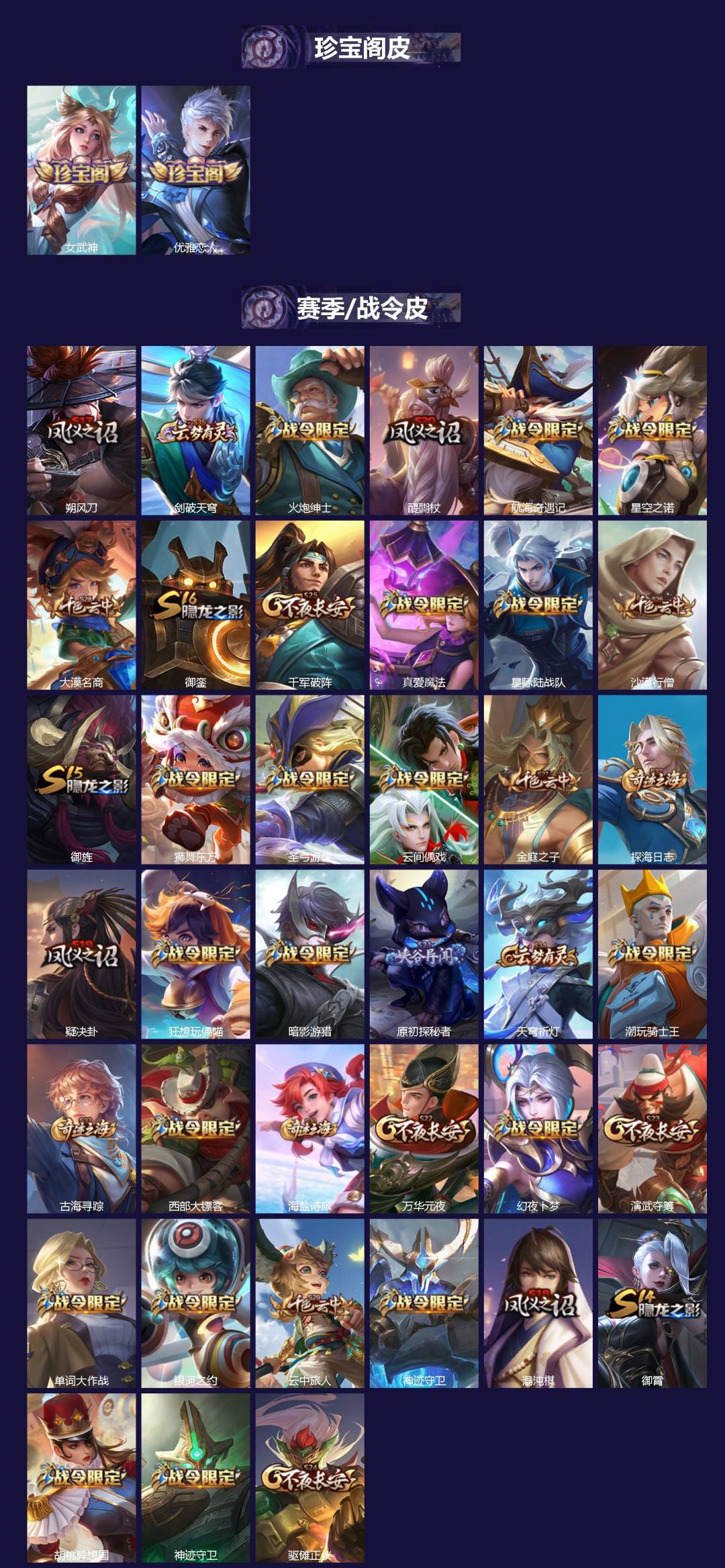 【传说皮】李逍遥,遇见胡旋,游龙清影(小青龙),仲夏夜之梦(大飞蛾),末日机甲-孙尚香(绿蚂蚱),一念神魔,淬星耀世,云鹰飞将(小将军),炽阳神光