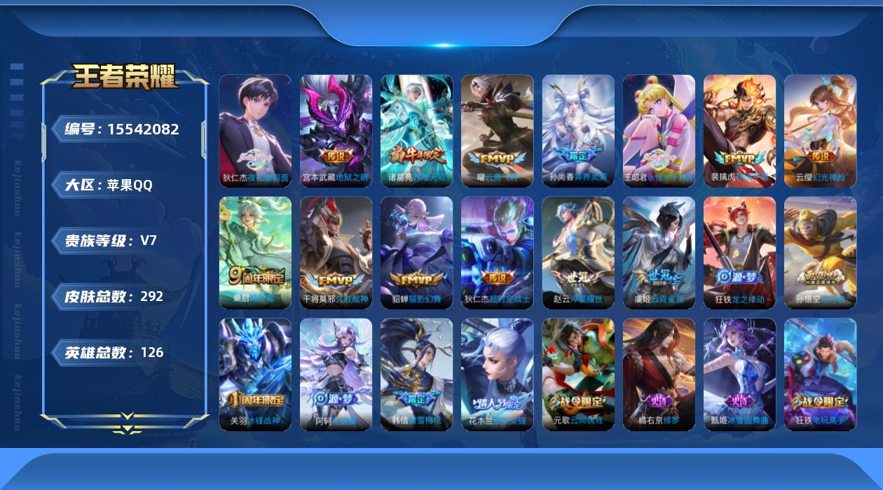 V7 14传说 126英雄 292皮肤 可修改实名 【英雄全皮】:蒙恬全皮