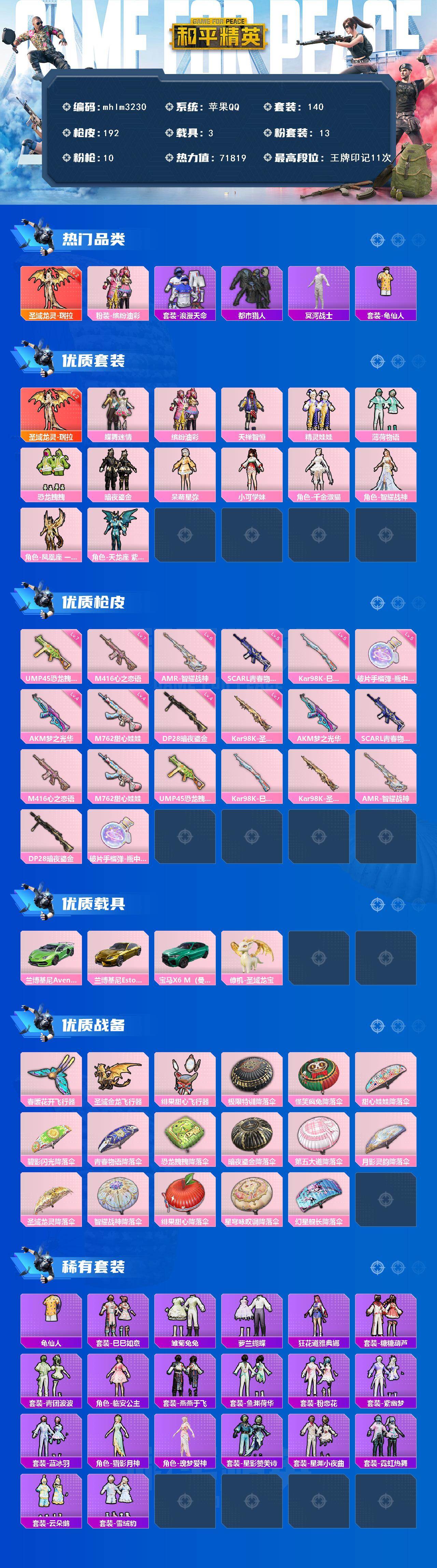 【mhlm3230】苹果 手Q-1神装-13粉装-10特效枪-3载具-3粉色飞行器-71819热力值-11王牌印记-140套装-192枪皮