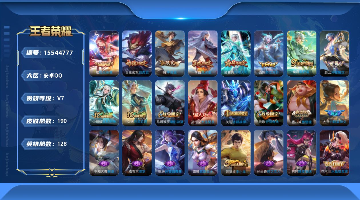 V7 1典藏 8传说 128英雄 190皮肤 可修改实名 【英雄全皮】敖隐全皮