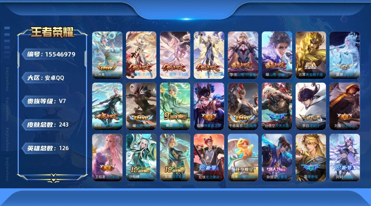 V7 18传说 126英雄 243皮肤 可修改实名 【英雄全皮】:蒙恬全皮,