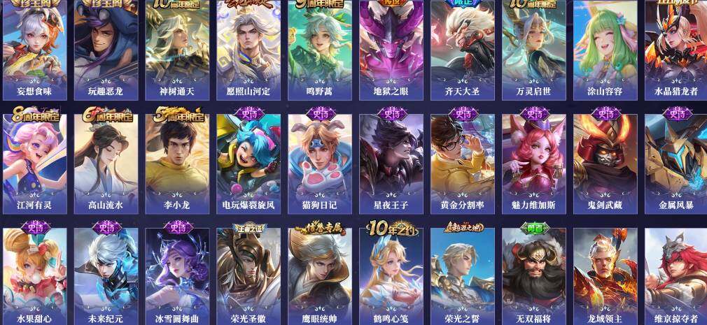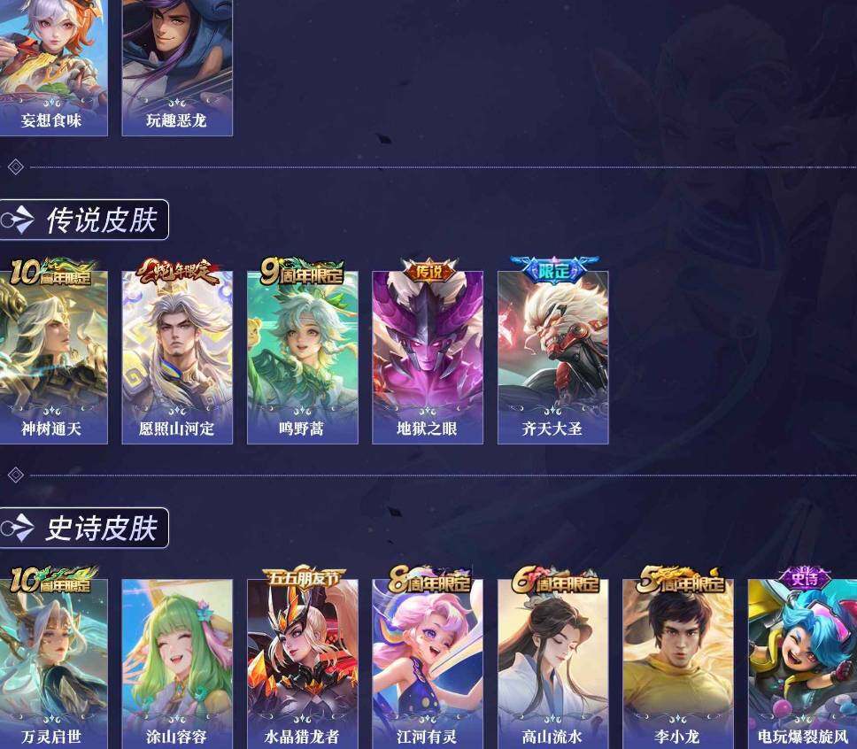 【限定皮肤】:白起狰,狄仁杰阴阳师,庄周高山流水,高渐离玩趣恶龙,芈月重明,曹操烛龙,狄仁杰万华元夜,达摩沙漠行僧,项羽海滩派对,老夫子醍醐杖,兰陵王金庭之子,孙悟空齐天大圣,太乙真人饕餮,鬼谷子原初探秘
